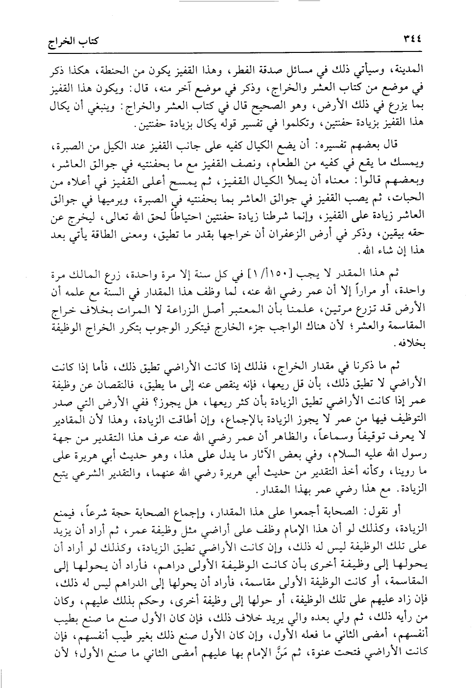 ثم ما ذكرنا في مقدار الخراج، فذلك إذا كانت الأراضي تطيق ذلك، فأما إذا كانت الأراضي لا تطيق ذلك، بأن قل ريعها، فإنه ينقص عنه إلى ما يطيق، فالنقصان عن وظيفة عمر إذا كانت الأراضي تطيق الزيادة بأن كثر ريعها، هل يجوز؟ ففي الأرض التي صدر التوظيف فيها من عمر لا يجوز الزيادة بالإجماع، وإن أطاقت الزيادة، وهذا لأن المقادير لا يعرف توقيفاً وسماعاً، والظاهر أن عمر رضي الله عنه عرف هذا التقدير من جهة رسول الله عليه السلام، وفي بعض الآثار ما يدل على هذا، وهو حديث أبي هريرة على ما روينا، وكأنه أخذ التقدير من حديث أبي هريرة رضي الله عنهما، والتقدير الشرعي يتبع الزيادة. مع هذا رضي عمر بهذا المقدار.