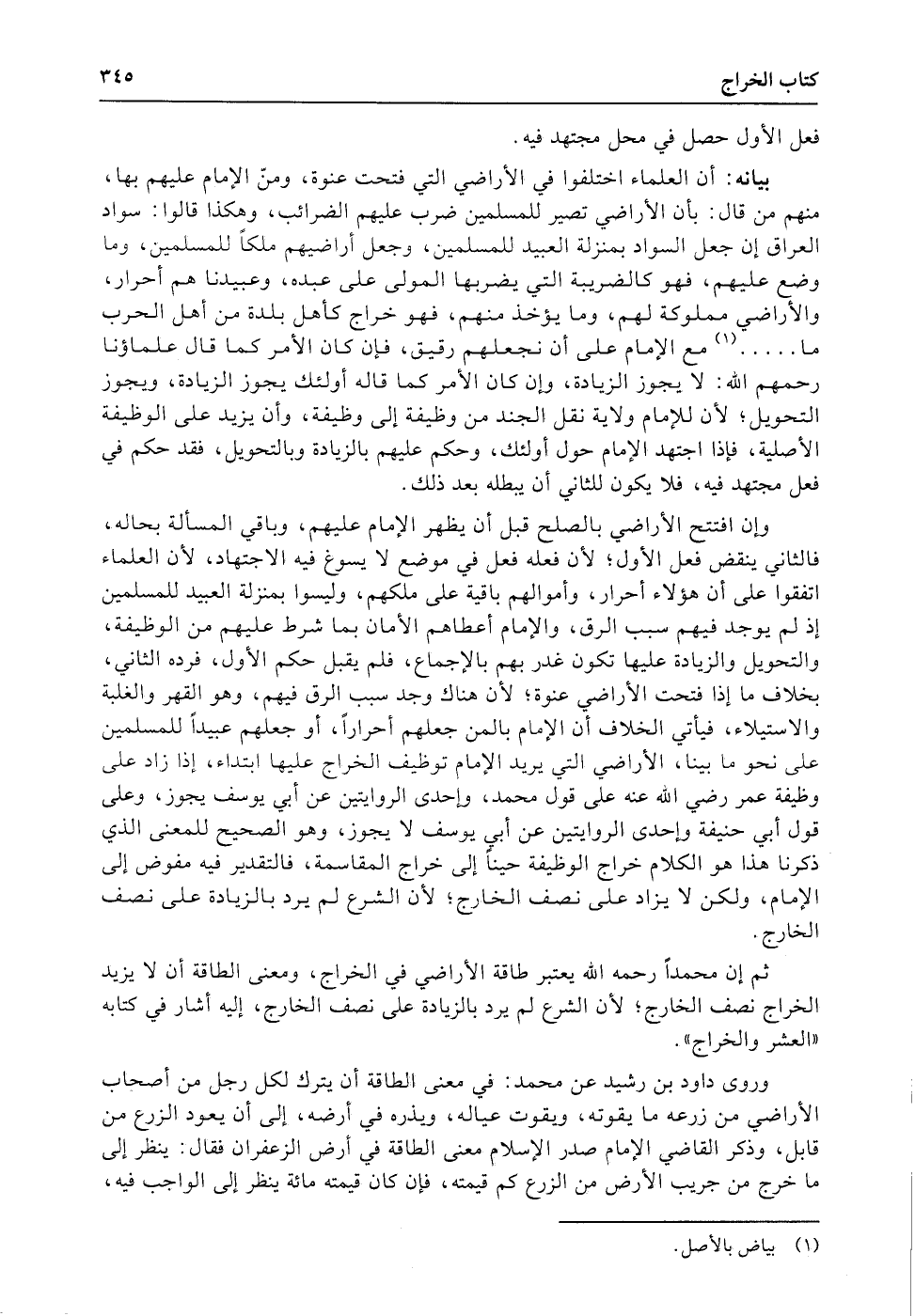 بيانه: أن العلماء اختلفوا في الأراضي التي فتحت عنوة، ومنّ الإمام عليهم بها، منهم من قال: بأن الأراضي تصير للمسلمين ضرب عليهم الضرائب، وهكذا قالوا: سواد العراق إن جعل السواد بمنزلة العبيد للمسلمين، وجعل أراضيهم ملكاً للمسلمين، وما وضع عليهم، فهو كالضريبة التي يضربها المولى على عبده، وعبيدنا هم أحرار، والأراضي مملوكة لهم، وما يؤخذ منهم، فهو خراج كأهل بلدة من أهل الحرب ما...... مع الإمام على أن نجعلهم رقيق، فإن كان الأمر كما قال علماؤنا رحمهم الله: لا يجوز الزيادة، وإن كان الأمر كما قاله أولئك يجوز الزيادة، ويجوز التحويل؛ لأن للإمام ولاية نقل الجند من وظيفة إلى وظيفة، وأن يزيد على الوظيفة الأصلية، فإذا اجتهد الإمام حول أولئك، وحكم عليهم بالزيادة وبالتحويل، فقد حكم في فعل مجتهد فيه، فلا يكون للثاني أن يبطله بعد ذلك.