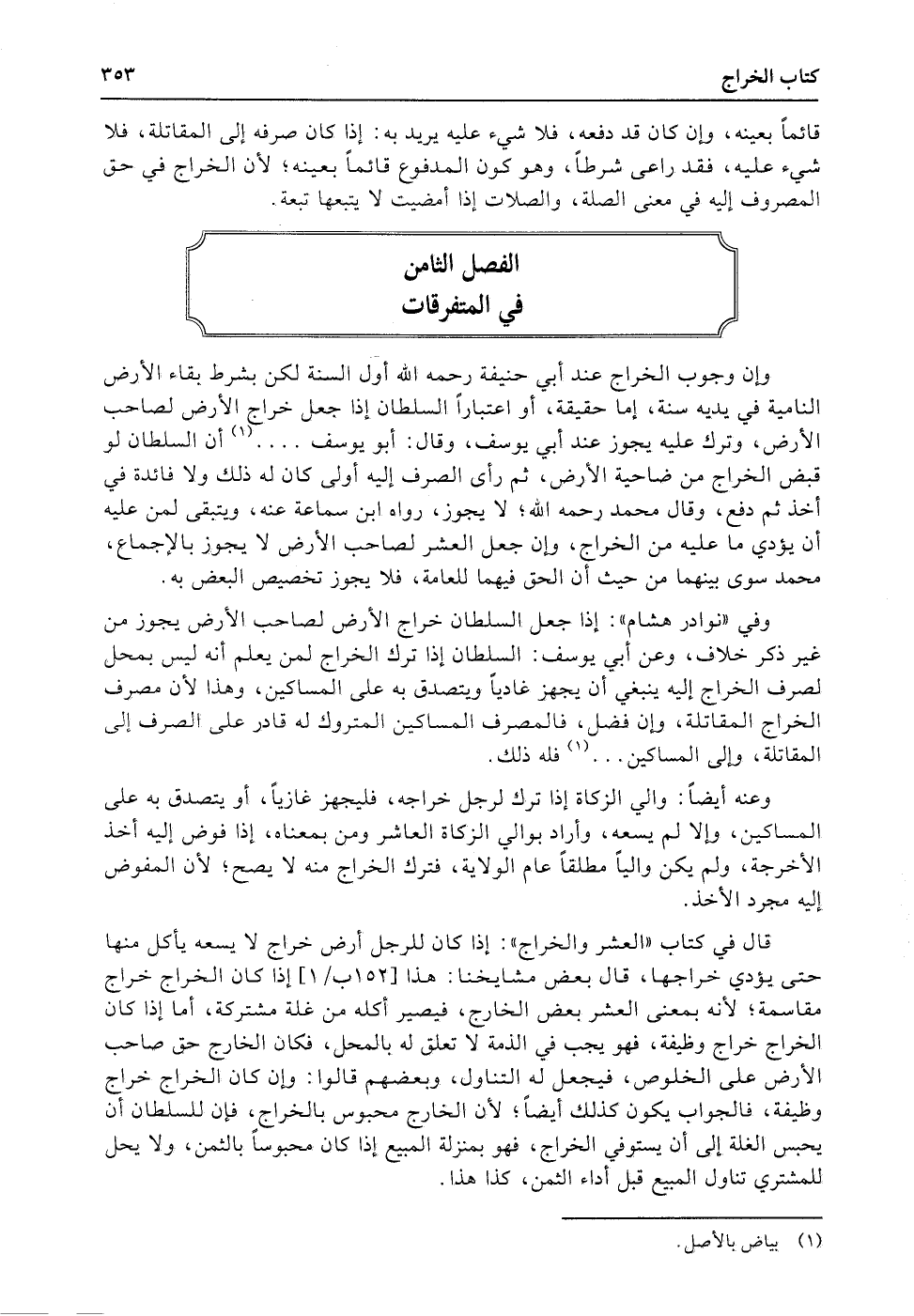 وفي «نوادر هشام» : إذا جعل السلطان خراج الأرض لصاحب الأرض يجوز من غير ذكر خلاف، وعن أبي يوسف: السلطان إذا ترك الخراج لمن يعلم أنه ليس بمحل لصرف الخراج إليه ينبغي أن يجهز غادياً ويتصدق به على المساكين، وهذا لأن مصرف الخراج المقاتلة، وإن فضل، فالمصرف المساكين المتروك له قادر على الصرف إلى المقاتلة، وإلى المساكين فله ذلك.