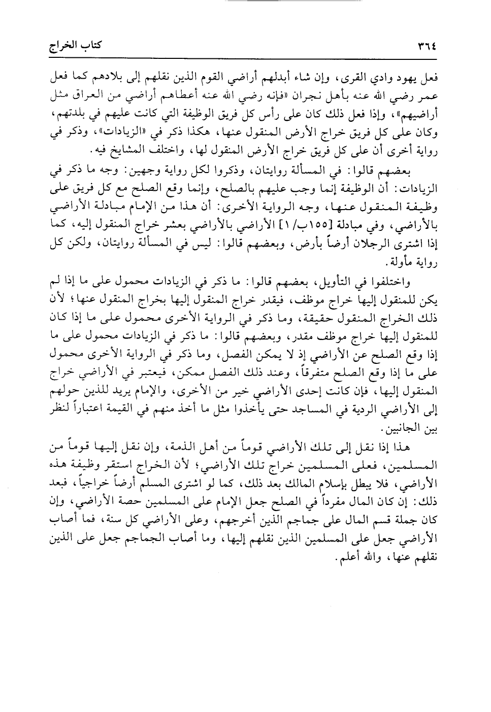 فعل يهود وادي القرى، وإن شاء أبدلهم أراضي القوم الذين نقلهم إلى بلادهم كما فعل عمر رضي الله عنه بأهل نجران «فإنه رضي الله عنه أعطاهم أراضي من العراق مثل أراضيهم» ، وإذا فعل ذلك كان على رأس كل فريق الوظيفة التي كانت عليهم في بلدتهم، وكان على كل فريق خراج الأرض المنقول عنها، هكذا ذكر في «الزيادات» ، وذكر في رواية أخرى أن على كل فريق خراج الأرض المنقول (لها) ، واختلف المشايخ فيه.