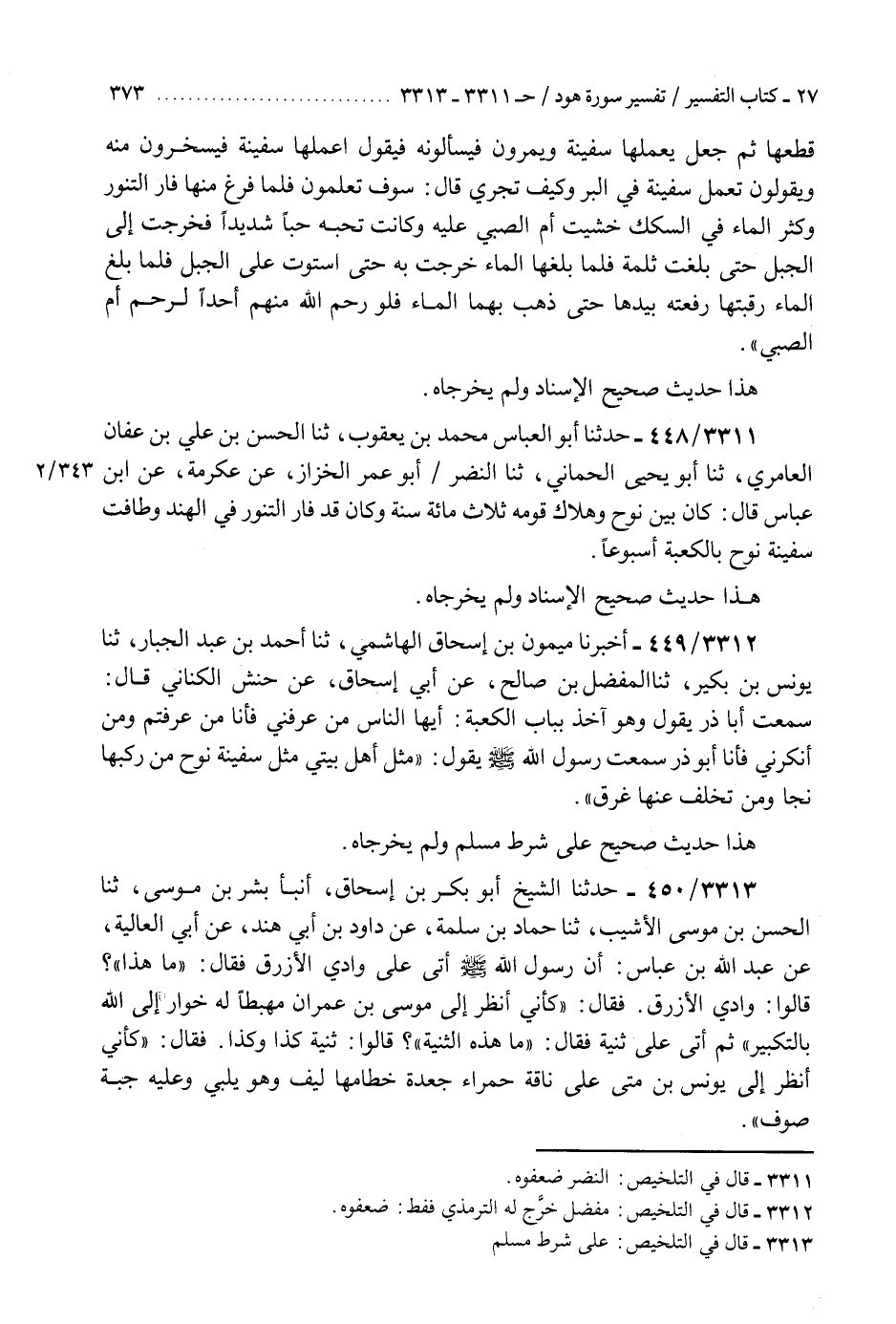 3311 - حَدَّثَنَا أَبُو الْعَبَّاسِ مُحَمَّدُ بْنُ يَعْقُوبَ، ثنا الْحَسَنُ بْنُ عَلِيِّ بْنِ عَفَّانَ الْعَامِرِيُّ، ثنا أَبُو يَحْيَى الْحِمَّانِيُّ، ثنا النَّضْرُ أَبُو عُمَرَ الْخَزَّازُ، عَنْ عِكْرِمَةَ، عَنِ ابْنِ عَبَّاسٍ، قَالَ: «§كَانَ بَيْنَ نُوحٍ وَهَلَاكِ قَوْمِهِ ثَلَاثُ مِائَةِ سَنَةٍ، وَكَانَ قَدْ فَارَ التَّنُّورُ فِي الْهِنْدِ وَطَافَتْ سَفِينَةُ نُوحٍ بِالْكَعْبَةِ أُسْبُوعًا» هَذَا حَدِيثٌ صَحِيحُ الْإِسْنَادِ وَلَمْ يُخْرِجَاهُK3311 - النضر ضعفوه