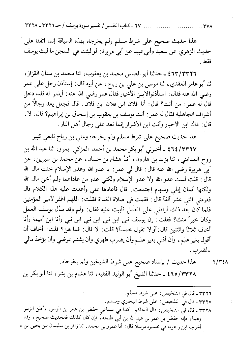 3327 - أَخْبَرَنِي أَبُو بَكْرٍ مُحَمَّدُ بْنُ أَحْمَدَ الْمُزَكِّي بِمَرْوَ، ثنا عَبْدُ اللَّهِ بْنُ رَوْحٍ الْمَدَاينِيُّ، ثنا يَزِيدُ بْنُ هَارُونَ، أَنْبَأَ هِشَامُ بْنُ حَسَّانَ، عَنْ مُحَمَّدِ بْنِ سِيرِينَ، عَنْ أَبِي هُرَيْرَةَ رَضِيَ اللَّهُ عَنْهُ، قَالَ: قَالَ لِي عُمَرُ: يَا عَدُوَّ اللَّهِ وَعَدُوَّ الْإِسْلَامِ خُنْتَ مَالَ اللَّهِ، قَالَ: قُلْتُ: لَسْتُ عَدُوَّ اللَّهِ، وَلَا عَدُوَّ الْإِسْلَامِ، وَلَكِنِّي عَدُوُّ مَنْ عَادَاهُمَا، وَلَمْ أَخُنْ مَالَ اللَّهِ، وَلَكِنَّهَا أَثْمَانُ إِبِلِي، وَسِهَامٌ اجْتَمَعَتْ. قَالَ: فَأَعَادَهَا عَلَيَّ وَأَعَدْتُ عَلَيْهِ هَذَا الْكَلَامَ، قَالَ: فَغَرَّمَنِي اثْنَيْ عَشَرَ أَلْفًا، قَالَ: فَقُمْتُ فِي صَلَاةِ الْغَدَاةِ، فَقُلْتُ: اللَّهُمَّ اغْفِرْ لِأَمِيرِ الْمُؤْمِنِينَ فَلَمَّا كَانَ بَعْدَ ذَلِكَ أَرَادَنِي عَلَى الْعَمَلِ، فَأَبَيْتُ عَلَيْهِ، فَقَالَ: وَلِمَ وَقَدْ سَأَلَ يُوسُفُ الْعَمَلَ وَكَانَ خَيْرًا مِنْكَ؟ فَقُلْتُ: إِنَّ يُوسُفَ نَبِيٌّ، ابْنُ نَبِيٍّ، ابْنِ نَبِيٍّ، ابْنِ نَبِيٍّ، وَأَنَا ابْنُ أُمَيْمَةَ وَأَنَا أَخَافُ ثَلَاثًا وَاثْنَتَيْنِ قَالَ: أَوَلَا تَقُولُ خَمْسًا؟ قُلْتُ: لَا قَالَ: فَمَا هُنَّ؟ قُلْتُ: «§أَخَافُ أَنْ أَقُولَ بِغَيْرِ عِلْمٍ، وَأَنْ أُفْتِيَ بِغَيْرِ عِلْمٍ، وَأَنْ يُضْرَبَ ظَهْرِي، وَأَنْ يُشْتَمَ عِرْضِي، وَأَنْ يُؤْخَذَ مَالِي بِالضَّرْبِ» هَذَا حَدِيثٌ بِإِسْنَادٍ صَحِيحٍ عَلَى شَرْطِ الشَّيْخَيْنِ وَلَمْ يُخْرِجَاهُ "K3327 - على شرط البخاري ومسلم