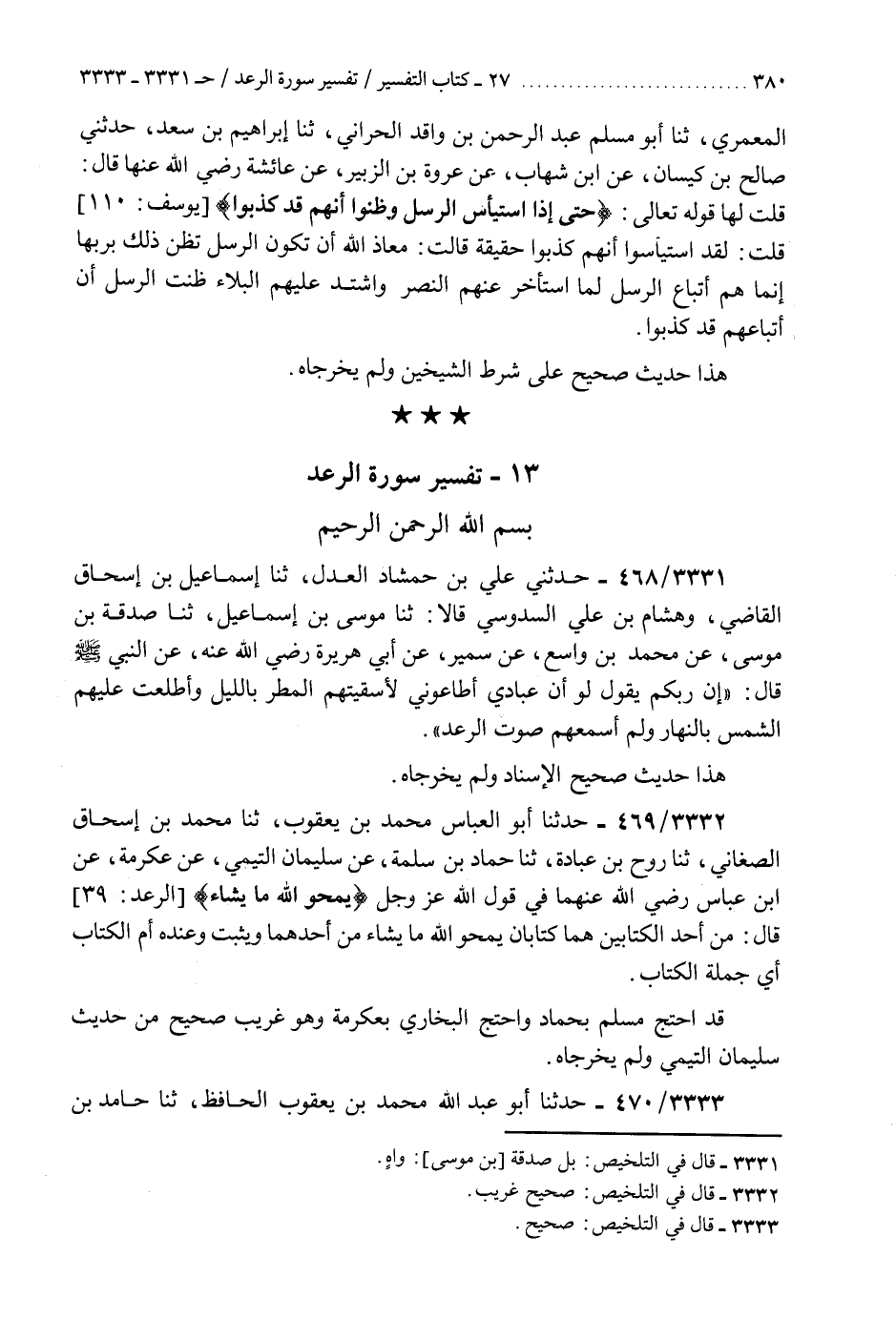 3332 - حَدَّثَنَا أَبُو الْعَبَّاسِ مُحَمَّدُ بْنُ يَعْقُوبَ، ثنا مُحَمَّدُ بْنُ إِسْحَاقَ الصَّغَانِيُّ، ثنا رَوْحُ بْنُ عُبَادَةَ، ثنا حَمَّادُ بْنُ سَلَمَةَ، عَنْ سُلَيْمَانَ التَّيْمِيِّ، عَنْ عِكْرِمَةَ، عَنِ ابْنِ عَبَّاسٍ رَضِيَ اللَّهُ عَنْهُمَا، فِي قَوْلِ اللَّهِ عَزَّ وَجَلَّ {يَمْحُو اللَّهُ مَا يَشَاءُ} [الرعد: 39] قَالَ: §" مِنْ أَحَدِ الْكِتَابَيْنِ هُمَا كِتَابَانِ يَمْحُو اللَّهُ مَا يَشَاءَ مِنْ أَحَدِهِمَا {وَيُثْبِتُ، وَعِنْدَهُ أُمُّ الْكِتَابِ} [الرعد: 39] أَيْ جُمْلَةُ الْكِتَابِ «قَدِ احْتَجَّ مُسْلِمٌ بِحَمَّادٍ وَاحْتَجَّ الْبُخَارِيُّ بِعِكْرِمَةَ» وَهُوَ غَرِيبٌ صَحِيحٌ مِنْ حَدِيثِ سُلَيْمَانِ التَّيْمِيِّ وَلَمْ يُخْرِجَاهُ "K3332 - صحيح غريب