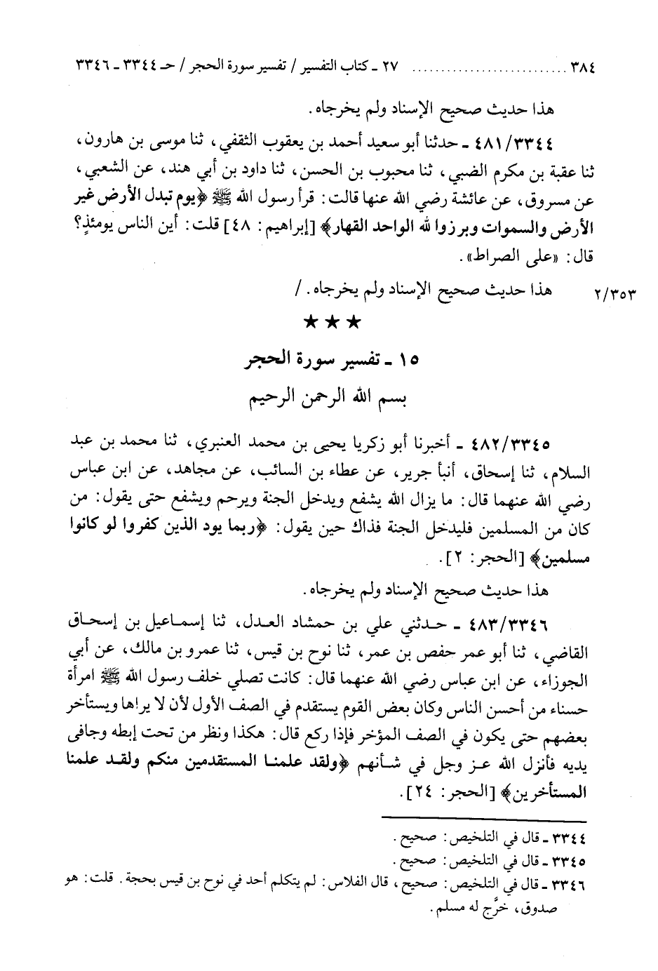 3345 - أَخْبَرَنَا أَبُو زَكَرِيَّا يَحْيَى بْنُ مُحَمَّدٍ الْعَنْبَرِيُّ، ثنا مُحَمَّدُ بْنُ عَبْدِ السَّلَامِ، ثنا إِسْحَاقُ، أَنْبَأَ جَرِيرٌ، عَنْ عَطَاءِ بْنِ السَّائِبِ، عَنْ مُجَاهِدٍ، عَنِ ابْنِ عَبَّاسٍ رَضِيَ اللَّهُ عَنْهُمَا، قَالَ: " §مَا يَزَالُ اللَّهُ يَشْفَعُ، وَيُدْخِلُ الْجَنَّةَ، وَيَرْحَمُ وَيُشَفَّعُ حَتَّى يَقُولَ: مَنْ كَانَ مِنَ الْمُسْلِمِينَ، فَلْيَدْخُلِ الْجَنَّةَ، فَذَاكَ حِينَ يَقُولُ {رُبَمَا يَوَدُّ الَّذِينَ كَفَرُوا لَوْ كَانُوا مُسْلِمَيْنَ} [الحجر: 2] «هَذَا حَدِيثٌ صَحِيحٌ الْإِسْنَادِ وَلَمْ يُخْرِجَاهُ» K3345 - صحيح