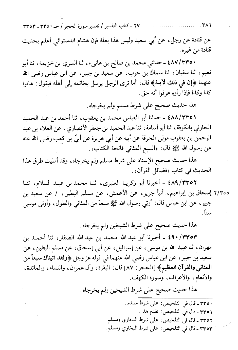 3353 - أَخْبَرَنَا أَبُو عَبْدِ اللَّهِ مُحَمَّدُ بْنُ عَبْدِ اللَّهِ الصَّفَّارُ، ثنا أَحْمَدُ بْنُ مِهْرَانَ، ثنا عُبَيْدُ اللَّهِ بْنُ مُوسَى، عَنْ إِسْرَائِيلَ، عَنْ أَبِي إِسْحَاقَ، عَنْ مُسْلِمٍ الْبَطِينِ، عَنْ سَعِيدِ بْنِ جُبَيْرٍ، عَنِ ابْنِ عَبَّاسٍ رَضِيَ اللَّهُ عَنْهُمَا، فِي قَوْلِهِ عَزَّ وَجَلَّ: {§وَلَقَدْ آتَيْنَاكَ سَبْعًا مِنَ الْمَثَانِي، وَالْقُرْآنَ الْعَظِيمَ} [الحجر: 87] قَالَ: الْبَقَرَةُ وَآلُ عِمْرَانَ وَالنِّسَاءُ وَالْمَائِدَةُ وَالْأَنْعَامُ وَالْأَعْرَافُ وَسُورَةُ الْكَهْفَ «هَذَا حَدِيثٌ صَحِيحٌ عَلَى شَرْطِ الشَّيْخَيْنِ وَلَمْ يُخْرِجَاهُ» K3353 - على شرط البخاري ومسلم