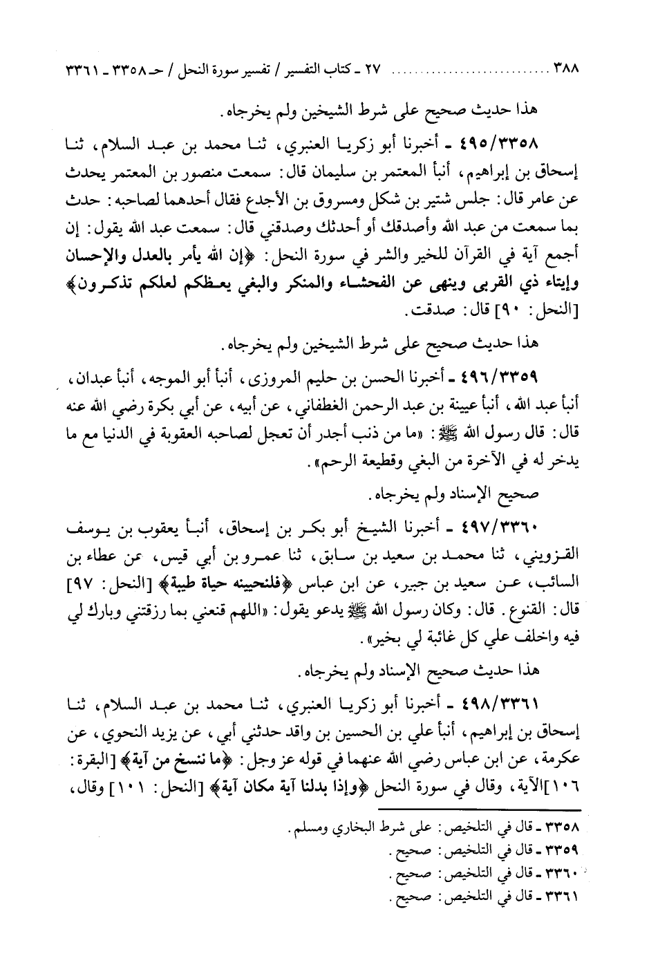 3358 - أَخْبَرَنَا أَبُو زَكَرِيَّا الْعَنْبَرِيُّ، ثنا مُحَمَّدُ بْنُ عَبْدِ السَّلَامِ، ثنا إِسْحَاقُ بْنُ إِبْرَاهِيمَ، أَنْبَأَ الْمُعْتَمِرُ بْنُ سُلَيْمَانَ، قَالَ: سَمِعْتُ مَنْصُورَ بْنَ الْمُعْتَمِرِ، يُحَدِّثُ، عَنْ عَامِرٍ، قَالَ: جَلَسَ شُتَيْرُ بْنُ شَكَلٍ وَمَسْرُوقُ بْنُ الْأَجْدَعِ فَقَالَ أَحَدُهُمَا لِصَاحِبِهِ: حَدِّثْ بِمَا سَمِعْتَ مِنْ عَبْدِ اللَّهِ وَأُصَدِّقُكَ أَوْ أُحَدِّثُكَ وَصَدِّقْنِي قَالَ: سَمِعْتُ عَبْدَ اللَّهِ يَقُولُ: " إِنَّ §أَجْمَعَ آيَةٍ فِي الْقُرْآنِ لِلْخَيْرِ وَالشَّرِّ فِي سُورَةِ النَّحْلِ: {إِنَّ اللَّهَ يَأْمُرُ بِالْعَدْلُ وَالْإِحْسَانِ وَإِيتَاءِ ذِي الْقُرْبَى وَيَنْهَى عَنِ الْفَحْشَاءِ وَالْمُنْكَرِ وَالْبَغْيِ، يَعِظُكُمْ لَعَلَّكُمْ تَذْكُرُونَ} [النحل: 90] قَالَ: صَدَقْتَ «هَذَا حَدِيثٌ صَحِيحٌ عَلَى شَرْطِ الشَّيْخَيْنِ وَلَمْ يُخْرِجَاهُ» K3358 - على شرط البخاري ومسلم