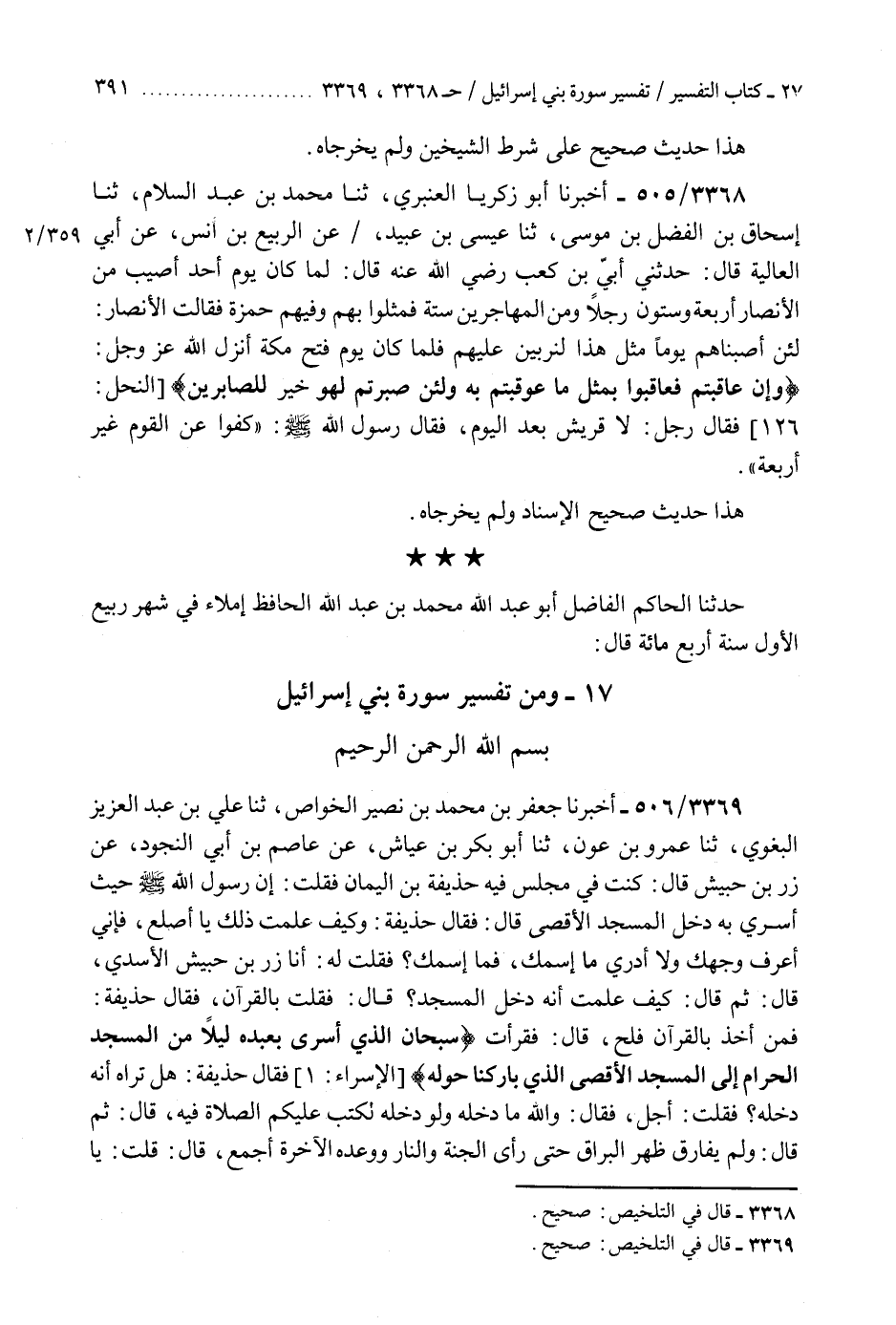 3369 - حَدَّثَنَا الْحَاكِمُ الْفَاضِلُ أَبُو عَبْدِ اللَّهِ مُحَمَّدُ بْنُ عَبْدِ اللَّهِ الْحَافِظُ إِمْلَاءً فِي شَهْرِ رَبِيعٍ الْأَوَّلِ سَنَةَ أَرْبَعِ مِائَةٍ قَالَ: أَخْبَرَنَا جَعْفَرُ بْنُ مُحَمَّدِ بْنِ نُصَيْرٍ الْخَوَّاصُ، ثنا عَلِيُّ بْنُ عَبْدِ الْعَزِيزِ الْبَغَوِيُّ، ثنا عَمْرُو بْنُ عَوْنٍ، ثنا أَبُو بَكْرِ بْنُ عَيَّاشٍ، عَنْ عَاصِمِ بْنِ أَبِي النَّجُودِ، عَنْ زِرِّ بْنِ حُبَيْشٍ، قَالَ: كُنْتُ فِي مَجْلِسٍ فِيهِ حُذَيْفَةُ بْنُ الْيَمَانِ فَقُلْتُ: إِنَّ §" رَسُولَ اللَّهِ صَلَّى اللهُ عَلَيْهِ وَسَلَّمَ حَيْثُ أُسْرِيَ بِهِ دَخَلَ الْمَسْجِدَ الْأَقْصَى قَالَ: فَقَالَ حُذَيْفَةُ: وَكَيْفَ عَلِمْتَ ذَلِكَ يَا أَصْلَعُ، فَإِنِّي أَعْرِفُ وَجْهَكَ وَلَا أَدْرِي مَا اسْمُكَ فَمَا اسْمُكَ؟ فَقُلْتُ لَهُ: أَنَا زِرُّ بْنُ حُبَيْشٍ الْأَسَدِيُّ قَالَ: ثُمَّ قَالَ: كَيْفَ عَلِمْتَ أَنَّهُ دَخَلَ الْمَسْجِدَ؟ قَالَ: فَقُلْتُ: بِالْقُرْآنِ. فَقَالَ حُذَيْفَةُ: فَمَنْ أَخَذَ بِالْقُرْآنِ فَلَحَ. قَالَ: فَقَرَأْتُ: {سُبْحَانَ الَّذِي أَسْرَى بِعَبْدِهِ لَيْلًا مِنَ الْمَسْجِدِ الْحَرَامِ إِلَى الْمَسْجِدِ الْأَقْصَى الَّذِي بَارَكْنَا حَوْلَهُ} [الإسراء: 1] فَقَالَ حُذَيْفَةُ: هَلْ تَرَاهُ أَنَّهُ دَخَلَهُ؟ فَقُلْتُ: أَجَلْ. فَقَالَ: وَاللَّهِ مَا دَخَلَهُ وَلَوْ دَخَلَهُ لَكُتِبَ عَلَيْكُمُ الصَّلَاةُ فِيهِ. قَالَ: ثُمَّ قَالَ: وَلَمْ يُفَارِقْ ظَهْرَ الْبُرَاقِ حَتَّى رَأَى الْجَنَّةَ وَالنَّارَ، وَوَعَدَهُ الْآخِرَةَ أَجْمَعَ. قَالَ: قُلْتُ: يَا أَبَا عَبْدِ اللَّهِ فَمَا الْبُرَاقُ قَالَ: دَابَّةٌ فَوْقَ الْحِمَارِ وَدُونَ الْبَغْلَةِ خُطْوَتُهُ مُدَّ بَصَرِهِ «هَذَا حَدِيثٌ صَحِيحُ الْإِسْنَادِ وَلَمْ يُخْرِجَاهُ» K3369 - صحيح