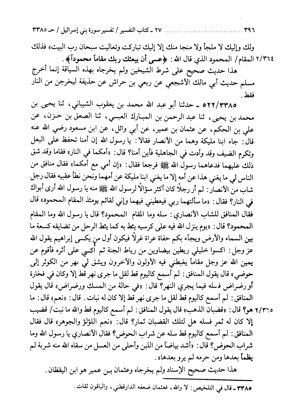 3385 - حَدَّثَنَا أَبُو عَبْدِ اللَّهِ مُحَمَّدُ بْنُ يَعْقُوبَ الشَّيْبَانِيُّ، ثنا يَحْيَى بْنُ مُحَمَّدِ بْنِ يَحْيَى، ثنا عَبْدُ الرَّحْمَنِ بْنُ الْمُبَارَكِ الْعَبْسِيُّ، ثنا الصَّعْقُ بْنُ حَزْنٍ، عَنْ عَلِيِّ بْنِ الْحَكَمِ، عَنْ عُثْمَانَ بْنِ عُمَيْرٍ، عَنْ أَبِي وَائِلٍ، عَنِ ابْنِ مَسْعُودٍ رَضِيَ اللَّهُ عَنْهُ، قَالَ: جَاءَ ابْنَا مُلَيْكَةَ وَهُمَا مِنَ الْأَنْصَارِ فَقَالَا: يَا رَسُولَ اللَّهِ، إِنَّ أُمَّنَا تَحْفَظُ عَلَى الْبَعْلِ، وَتُكْرِمُ الضَّيْفَ، وَقَدْ وَأَدَتْ فِي الْجَاهِلِيَّةِ فَأَيْنَ أُمُّنَا؟ قَالَ: «أُمُّكُمَا فِي النَّارِ» فَقَامَا وَقَدْ شَقَّ ذَلِكَ عَلَيْهِمَا فَدَعَاهُمَا رَسُولُ اللَّهِ صَلَّى اللهُ عَلَيْهِ وَسَلَّمَ فَرَجَعَا فَقَالَ: «إِنَّ أُمِّي مَعَ أُمِّكُمَا» فَقَالَ مُنَافِقٌ مِنَ النَّاسِ لِي: مَا يُغْنِي هَذَا عَنْ أُمِّهِ إِلَّا مَا يُغْنِي ابْنَا مُلَيْكَةَ عَنْ أُمِّهِمَا وَنَحْنُ نَطَأُ عَقِبَيْهِ، فَقَالَ رَجُلٌ شَابٌّ مِنَ الْأَنْصَارِ لَمْ أَرْ رَجُلًا كَانَ أَكْثَرَ سُؤَالًا لِرَسُولِ اللَّهِ صَلَّى اللهُ عَلَيْهِ وَسَلَّمَ مِنْهُ: يَا رَسُولَ اللَّهِ، أَرَى أَبَوَاكَ فِي النَّارِ فَقَالَ: §«مَا سَأَلْتُهُمَا رَبِّي فَيُعْطِينِي فِيهِمَا وَإِنِّي لَقَائِمٌ يَوْمَئِذٍ الْمَقَامَ الْمَحْمُودَ» قَالَ: فَقَالَ الْمُنَافِقُ لِلشَّابِّ الْأَنْصَارِيِّ: سَلْهُ وَمَا الْمَقَامُ الْمَحْمُودُ؟ قَالَ: يَا رَسُولَ اللَّهِ، وَمَا الْمَقَامُ الْمَحْمُودُ؟ قَالَ: " يَوْمَ يَنْزِلُ اللَّهُ فِيهِ عَلَى كُرْسِيِّهِ يَئِطُّ بِهِ كَمَا يَئِطُّ الرَّحْلُ مِنْ تَضَايُقِهِ كَسَعَةِ مَا بَيْنَ السَّمَاءِ وَالْأَرْضِ وَيُجَاءُ بِكُمْ حُفَاةً عُرَاةً غُرْلًا فَيَكُونُ أَوَّلَ مَنْ يُكْسَى إِبْرَاهِيمُ يَقُولُ اللَّهُ عَزَّ وَجَلَّ: اكْسُوا خَلِيلِي رَيْطَتَيْنِ بَيْضَاوَيْنِ مِنْ رِيَاطِ الْجَنَّةِ، ثُمَّ أُكْسَى عَلَى أَثَرِهِ فَأَقُومُ عَنْ يَمِينِ اللَّهِ عَزَّ وَجَلَّ مَقَامًا يَغْبِطُنِي فِيهِ الْأَوَّلُونَ وَالْآخِرُونَ وَيُشَقُّ لِي نَهَرٌ مِنَ الْكَوْثَرِ إِلَى حَوْضِي " قَالَ: يَقُولُ الْمُنَافِقُ: لَمْ أَسْمَعْ كَالْيَوْمِ قَطُّ، لَقَلَّ مَا جَرَى نَهَرٌ قَطُّ إِلَّا وَكَانَ فِي فَخَّارَةٍ أَوْ رَضْرَاضٍ فَسَلْهُ فِيمَا يَجْرِي النَّهَرُ؟ قَالَ: «فِي حَالَةٍ مِنَ الْمِسْكِ وَرَضْرَاضٍ» قَالَ: يَقُولُ الْمُنَافِقُ: لَمْ أَسْمَعْ كَالْيَوْمِ قَطُّ، لَقَلَّ مَا جَرَى نَهَرٌ قَطُّ إِلَّا كَانَ لَهُ نَبَاتٌ قَالَ: «نَعَمْ» قَالَ: مَا هُوَ؟ قَالَ: «قُضْبَانُ الذَّهَبِ» قَالَ: يَقُولُ الْمُنَافِقُ: لَمْ أَسْمَعْ كَالْيَوْمِ قَطُّ، وَاللَّهِ مَا نَبَتَ قَضِيبٌ إِلَّا كَانَ لَهُ ثَمَرٌ فَسَلْهُ هَلْ لِتِلْكَ الْقُضْبَانِ ثِمَارٌ؟ قَالَ: «نَعَمْ، اللُّؤْلُؤُ وَالْجَوْهَرُ» قَالَ: فَقَالَ الْمُنَافِقُ: لَمْ أَسْمَعْ كَالْيَوْمِ قَطُّ، سَلْهُ عَنْ شَرَابِ الْحَوْضِ، فَقَالَ الْأَنْصَارِيُّ: يَا رَسُولَ اللَّهِ، وَمَا شَرَابُ الْحَوْضِ؟ قَالَ: «أَشَدُّ بَيَاضًا مِنَ اللَّبَنِ وَأَحْلَى مِنَ الْعَسَلِ مَنْ سَقَاهُ اللَّهُ مِنْهُ شَرْبَةً لَمْ يَظْمَأْ بَعْدَهَا وَمَنْ حَرَمَهُ لَمْ يَرْوِ بَعْدَهَا» هَذَا حَدِيثٌ صَحِيحُ الْإِسْنَادِ وَلَمْ يُخَرِّجَاهُ «وَعُثْمَانُ بْنُ عُمَيْرٍ هُوَ ابْنُ الْيَقْظَانِ» K3385 - لا والله فعثمان ضعفه الدراقطني والباقون ثقات