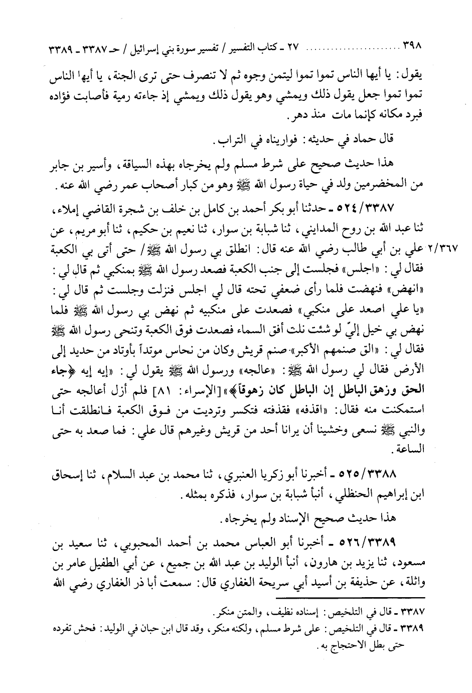 3387 - حَدَّثَنَا أَبُو بَكْرٍ أَحْمَدُ بْنُ كَامِلِ بْنِ خَلَفِ بْنُ شَجَرَةَ الْقَاضِي إِمْلَاءً، ثنا عَبْدُ اللَّهِ بْنُ رَوْحٍ الْمَدَاينِيُّ، ثنا شَبَابَةُ بْنُ سَوَّارٍ، ثنا نُعَيْمُ بْنُ حَكِيمٍ، ثنا أَبُو مَرْيَمَ، عَنْ عَلِيِّ بْنِ أَبِي طَالِبٍ رَضِيَ اللَّهُ عَنْهُ، قَالَ: انْطَلَقَ بِي رَسُولُ اللَّهِ صَلَّى اللهُ عَلَيْهِ وَسَلَّمَ حَتَّى أَتَى بِيَ الْكَعْبَةَ فَقَالَ لِي: §«اجْلِسْ» فَجَلَسْتُ إِلَى جَنْبِ الْكَعْبَةِ فَصَعِدَ رَسُولُ اللَّهِ صَلَّى اللهُ عَلَيْهِ وَسَلَّمَ بِمَنْكِبِي، ثُمَّ قَالَ لِي: «انْهَضْ» فَنَهَضْتُ فَلَمَّا رَأَى ضَعْفِي تَحْتَهُ قَالَ لِي: «اجْلِسْ» فَنَزَلْتُ وَجَلَسْتُ ثُمَّ قَالَ لِي: «يَا عَلِيُّ اصْعَدْ عَلَى مَنْكِبِي» فَصَعِدْتُ عَلَى مَنْكِبَيْهِ، ثُمَّ نَهَضَ بِي رَسُولُ اللَّهِ صَلَّى اللهُ عَلَيْهِ وَسَلَّمَ، فَلَمَّا نَهَضَ بِي خُيِّلَ إِلَيَّ لَوْ شِئْتُ نِلْتُ أُفُقَ السَّمَاءِ فَصَعِدْتُ فَوْقَ الْكَعْبَةِ وَتَنَحَّى رَسُولُ اللَّهِ صَلَّى اللهُ عَلَيْهِ وَسَلَّمَ فَقَالَ لِي: «أَلْقِ صَنَمَهُمُ الْأَكْبَرَ صَنَمَ قُرَيْشٍ» وَكَانَ مِنْ نُحَاسٍ مُوَتَّدًا بِأَوْتَادٍ مِنْ حَدِيدٍ إِلَى الْأَرْضِ، فَقَالَ لِي رَسُولُ اللَّهِ صَلَّى اللهُ عَلَيْهِ وَسَلَّمَ: «عَالِجْهُ» وَرَسُولُ اللَّهِ صَلَّى اللهُ عَلَيْهِ وَسَلَّمَ يَقُولُ لِي: إِيهٍ إِيهٍ {جَاءَ الْحَقُّ وَزَهَقَ الْبَاطِلُ إِنَّ الْبَاطِلَ كَانَ زَهُوقًا} [الإسراء: 81] " فَلَمْ أَزَلْ أُعَالِجُهُ حَتَّى اسْتَمْكَنْتُ مِنْهُ فَقَالَ اقْذِفْهُ فَقَذَفْتُهُ فَتَكَسَّرَ وَتَرَدَّيْتُ مِنْ فَوْقِ الْكَعْبَةِ، فَانْطَلَقْتُ أَنَا وَالنَّبِيُّ صَلَّى اللهُ عَلَيْهِ وَسَلَّمَ نَسْعَى وَخَشِينَا أَنْ يَرَانَا أَحَدٌ مِنْ قُرَيْشٍ وَغَيْرِهِمْ، قَالَ عَلِيٌّ: فَمَا صُعِدَ بِهِ حَتَّى السَّاعَةِ