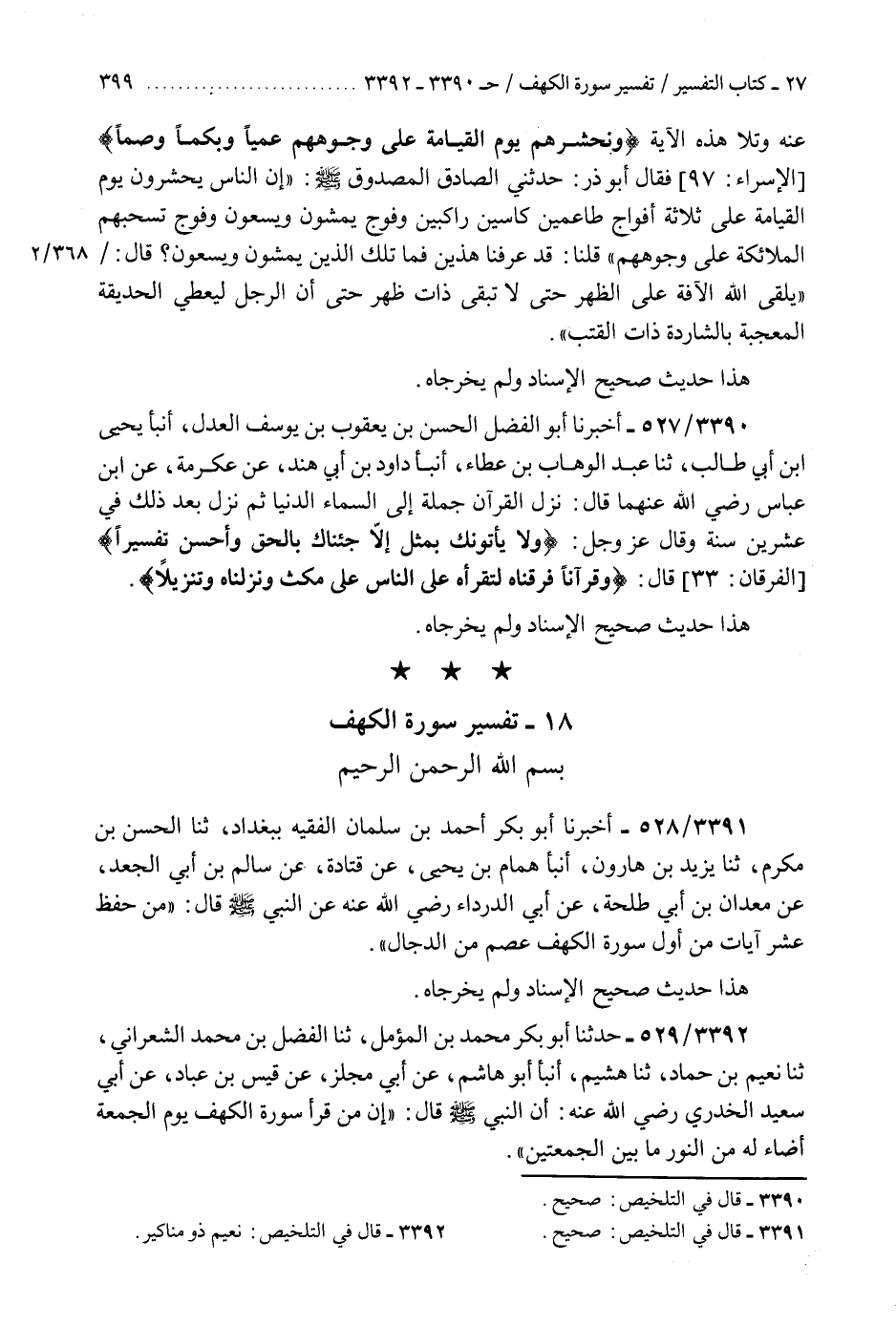 3392 - حَدَّثَنَا أَبُو بَكْرٍ مُحَمَّدُ بْنُ الْمُؤَمَّلِ، ثنا الْفَضْلُ بْنُ مُحَمَّدٍ الشَّعْرَانِيُّ، ثنا نُعَيْمُ بْنُ حَمَّادٍ، ثنا هُشَيْمٌ، أَنْبَأَ أَبُو هَاشِمٍ، عَنْ أَبِي مِجْلَزٍ، عَنْ قَيْسِ بْنِ عَبَّادٍ، عَنْ أَبِي سَعِيدٍ الْخُدْرِيِّ رَضِيَ اللَّهُ عَنْهُ، أَنَّ النَّبِيَّ صَلَّى اللهُ عَلَيْهِ وَسَلَّمَ قَالَ: §«إِنَّ مَنْ قَرَأَ سُورَةَ الْكَهْفِ يَوْمَ الْجُمُعَةِ أَضَاءَ لَهُ مِنَ النُّورِ مَا بَيْنَ الْجُمُعَتَيْنِ» هَذَا حَدِيثٌ صَحِيحُ الْإِسْنَادِ وَلَمْ يُخْرِجَاهُ "K3392 - نعيم ذو مناكير