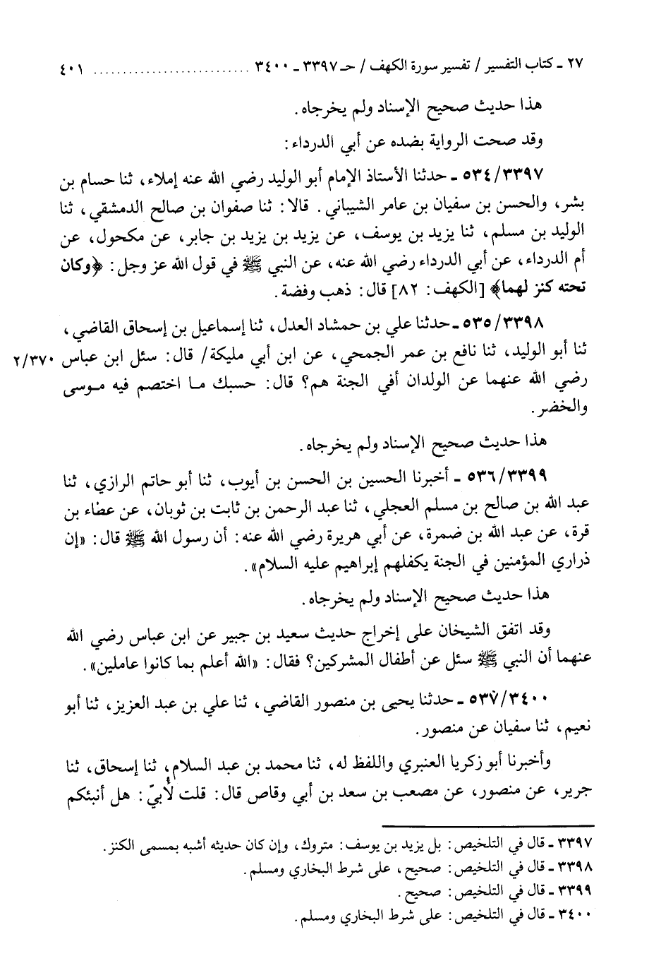 3397 - حَدَّثَنَا الْأُسْتَاذُ الْإِمَامُ أَبُو الْوَلِيدِ رَضِيَ اللَّهُ عَنْهُ، إِمْلَاءً، ثنا حُسَامُ بْنُ بِشْرٍ، وَالْحَسَنُ بْنُ سُفْيَانَ بْنِ عَامِرٍ الشَّيْبَانِيُّ، قَالَا: ثنا صَفْوَانُ بْنُ صَالِحٍ الدِّمَشْقِيُّ، ثنا الْوَلِيدُ بْنُ مُسْلِمٍ، ثنا يَزِيدُ بْنُ يُوسُفَ، عَنْ يَزِيدَ بْنَ يَزِيدَ بْنِ جَابِرٍ، عَنْ مَكْحُولٍ، عَنْ أُمِّ الدَّرْدَاءِ، عَنْ أَبِي الدَّرْدَاءِ رَضِيَ اللَّهُ عَنْهُ، عَنِ النَّبِيِّ صَلَّى اللهُ عَلَيْهِ وَسَلَّمَ فِي قَوْلِ اللَّهِ عَزَّ وَجَلَّ: {§وَكَانَ تَحْتَهُ كَنْزٌ لَهُمَا} [الكهف: 82] قَالَ: «ذَهَبٌ وَفِضَّةٌ» K3397 - بل يزيد بن يوسف متروك