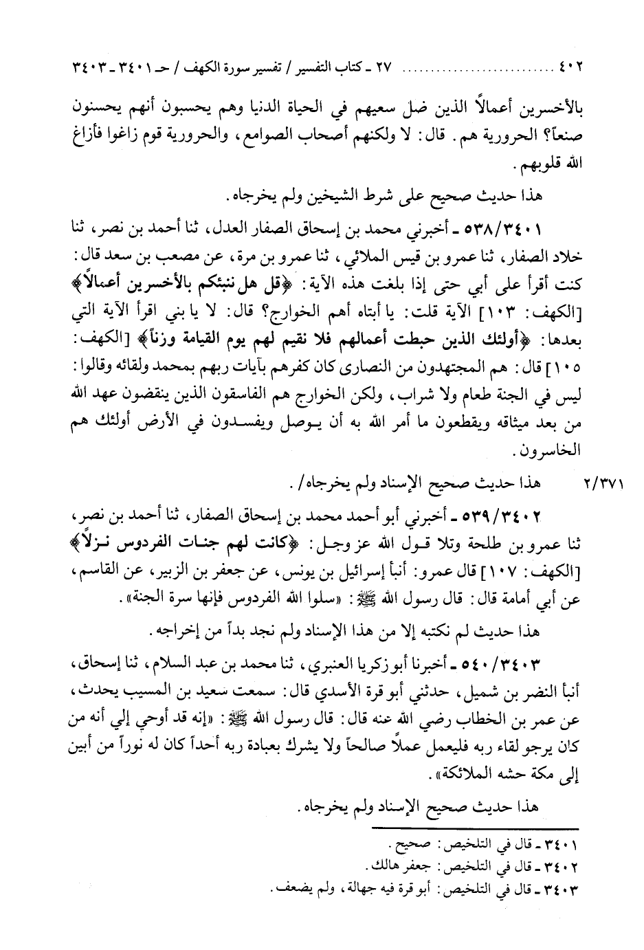 3401 - أَخْبَرَنِي مُحَمَّدُ بْنُ إِسْحَاقَ الصَّفَّارُ الْعَدْلُ، ثنا أَحْمَدُ بْنُ نَصْرٍ، ثنا خَلَّادٌ الصَّفَّارُ، ثنا عَمْرُو بْنُ قَيْسٍ الْمُلَائِيُّ، ثنا عَمْرُو بْنُ مُرَّةَ، عَنْ مُصْعَبِ بْنِ سَعْدٍ، قَالَ: كُنْتُ أَقْرَأُ عَلَى أَبِي حَتَّى إِذَا بَلَغْتُ هَذِهِ الْآيَةَ {قُلْ هَلْ نُنَبِّئُكُمْ بِالْأَخْسَرِينَ أَعْمَالًا} [الكهف: 103] الْآيَةُ، قُلْتُ يَا أَبَتَاهُ أَهُمُ الْخَوَارِجُ؟ قَالَ: لَا يَا بُنَيَّ اقْرَأِ الْآيَةَ الَّتِي بَعْدَهَا {أُولَئِكَ الَّذِينَ كَفَرُوا بِآيَاتِ رَبِّهِمْ وَلِقَائِهِ فَحَبِطَتْ أَعْمَالُهُمْ فَلَا نُقِيمُ لَهُمْ يَوْمَ الْقِيَامَةِ وَزْنًا} [الكهف: 105] قَالَ: §«هُمُ الْمُجْتَهِدُونَ مِنَ النَّصَارَى كَانَ كُفْرُهُمْ بِآيَاتِ رَبِّهِمْ بِمُحَمَّدٍ وَلِقَائِهِ» وَقَالُوا: لَيْسَ فِي الْجَنَّةِ طَعَامٌ وَلَا شَرَابٌ وَلَكِنَّ الْخَوَارِجَ هُمُ الْفَاسِقُونَ الَّذِينَ يَنْقُضُونَ عَهْدَ اللَّهِ مِنْ بَعْدِ مِيثَاقِهِ وَيَقْطَعُونَ مَا أَمَرَ اللَّهُ بِهِ أَنْ يُوصَلَ وَيُفْسِدُونَ فِي الْأَرْضِ أُولَئِكَ هُمُ الْخَاسِرُونَ «هَذَا حَدِيثٌ صَحِيحُ الْإِسْنَادِ وَلَمْ يُخْرِجَاهُ» K3401 - صحيح