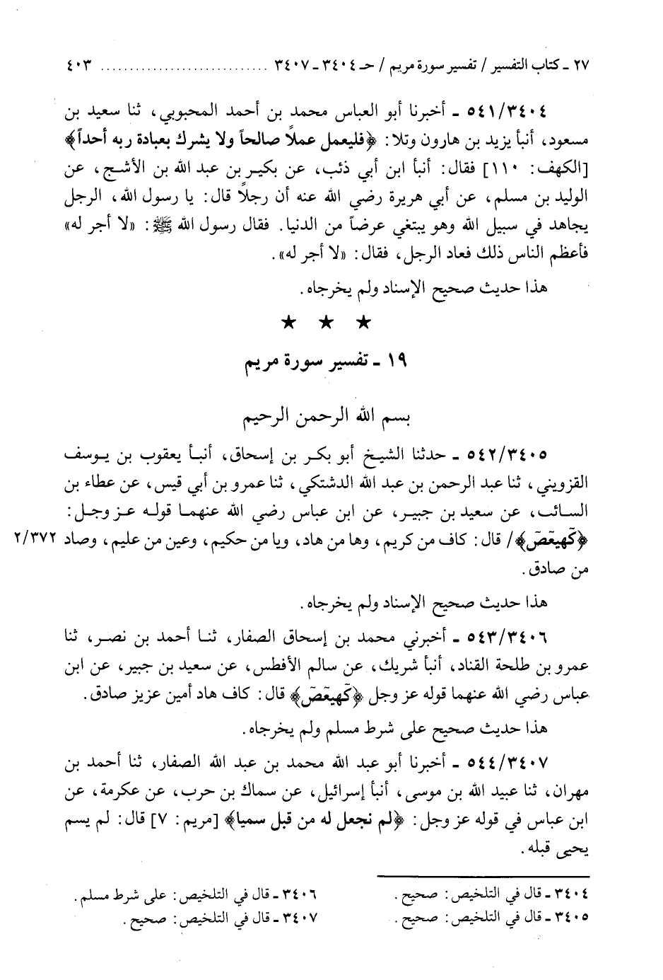3405 - حَدَّثَنَا الشَّيْخُ أَبُو بَكْرِ بْنُ إِسْحَاقَ، أَنْبَأَ يَعْقُوبُ بْنُ يُوسُفَ الْقَزْوِينِيُّ، ثنا عَبْدُ الرَّحْمَنِ بْنُ عَبْدِ اللَّهِ الدَّشْتَكِيُّ، ثنا عَمْرُو بْنُ أَبِي قَيْسٍ، عَنْ عَطَاءِ بْنِ السَّائِبِ، عَنْ سَعِيدِ بْنِ جُبَيْرٍ، عَنِ ابْنِ عَبَّاسٍ رَضِيَ اللَّهُ عَنْهُمَا، قَوْلُهُ عَزَّ وَجَلَّ: {§كهيعص} [مريم: 1] قَالَ: كَافٌّ مِنْ كَرِيمٍ، وَهَا مِنْ هَادٍ، وَيَا مِنْ حَكِيمٍ، وَعَيْنٌ مِنْ عَلِيمٍ، وَصَادٌ مِنْ صَادِقٍ «هَذَا حَدِيثٌ صَحِيحُ الْإِسْنَادِ وَلَمْ يُخْرِجَاهُ» K3405 - صحيح
