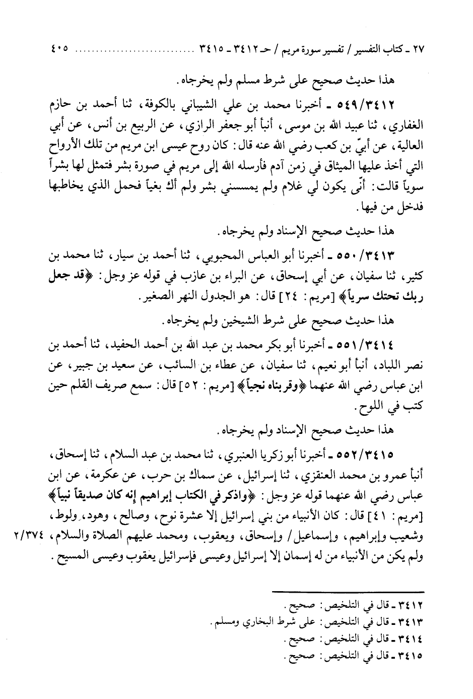 3414 - أَخْبَرَنَا أَبُو بَكْرٍ مُحَمَّدُ بْنُ عَبْدِ اللَّهِ بْنِ أَحْمَدَ الْحَفِيدُ، ثنا أَحْمَدُ بْنُ نَصْرٍ اللَّبَّادُ، أَنْبَأَ أَبُو نُعَيْمٍ، ثنا سُفْيَانُ، عَنْ عَطَاءِ بْنِ السَّائِبِ، عَنْ سَعِيدِ بْنِ جُبَيْرٍ، عَنِ ابْنِ عَبَّاسٍ رَضِيَ اللَّهُ عَنْهُمَا: {§وَقَرَّبْنَاهُ نَجِيًّا} [مريم: 52] قَالَ: «سَمِعَ صَرِيفَ الْقَلَمِ حِينَ كَتَبَ فِي اللَّوْحِ» هَذَا حَدِيثٌ صَحِيحُ الْإِسْنَادِ وَلَمْ يُخْرِجَاهُ "K3414 - صحيح
