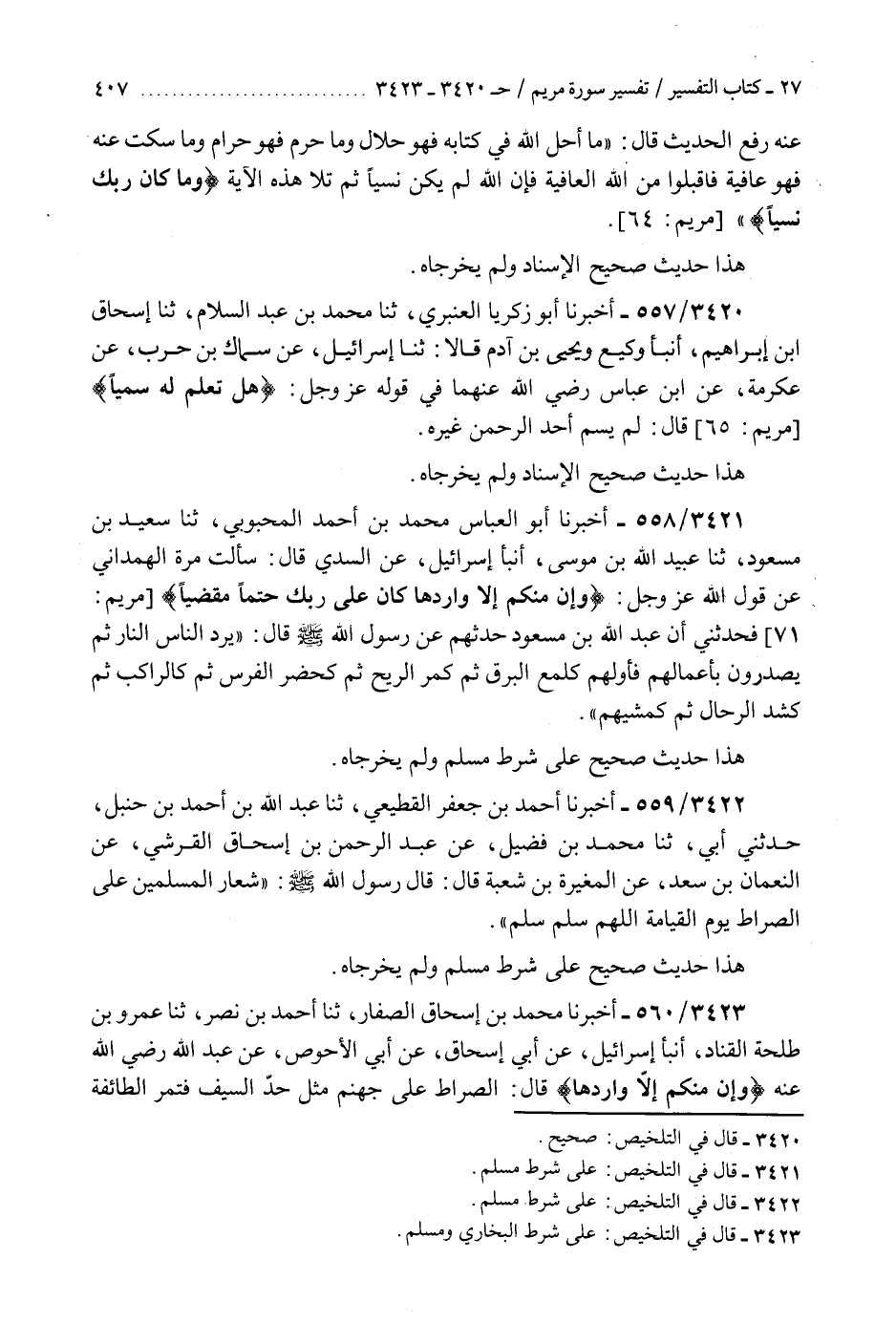 3423 - أَخْبَرَنَا مُحَمَّدُ بْنُ إِسْحَاقَ الصَّفَّارُ، ثنا أَحْمَدُ بْنُ نَصْرٍ، ثنا عَمْرُو بْنُ طَلْحَةَ الْقَنَّادُ، أَنْبَأَ إِسْرَائِيلُ، عَنْ أَبِي إِسْحَاقَ، عَنْ أَبِي الْأَحْوَصِ، عَنْ عَبْدِ اللَّهِ رَضِيَ اللَّهُ عَنْهُ، {وَإِنْ مِنْكُمْ إِلَّا وَارِدُهَا} [مريم: 71] قَالَ: §" الصِّرَاطُ عَلَى جَهَنَّمَ مِثْلُ حَدِّ السَّيْفِ فَتَمُرُّ الطَّائِفَةُ الْأُولَى كَالْبَرْقِ، وَالثَّانِيَةُ كَالرِّيحِ، وَالثَّالِثَةُ كَأَجْوَدِ الْخَيْلِ، وَالرَّابِعَةُ كَأَجْوَدِ الْإِبِلِ وَالْبَهَائِمِ، ثُمَّ يَمُرُّونَ وَالْمَلَائِكَةُ تَقُولُ: رَبِّ سَلِّمْ سَلِّمْ «هَذَا حَدِيثٌ صَحِيحٌ عَلَى شَرْطِ الشَّيْخَيْنِ وَلَمْ يُخْرِجَاهُ» K3423 - على شرط البخاري ومسلم