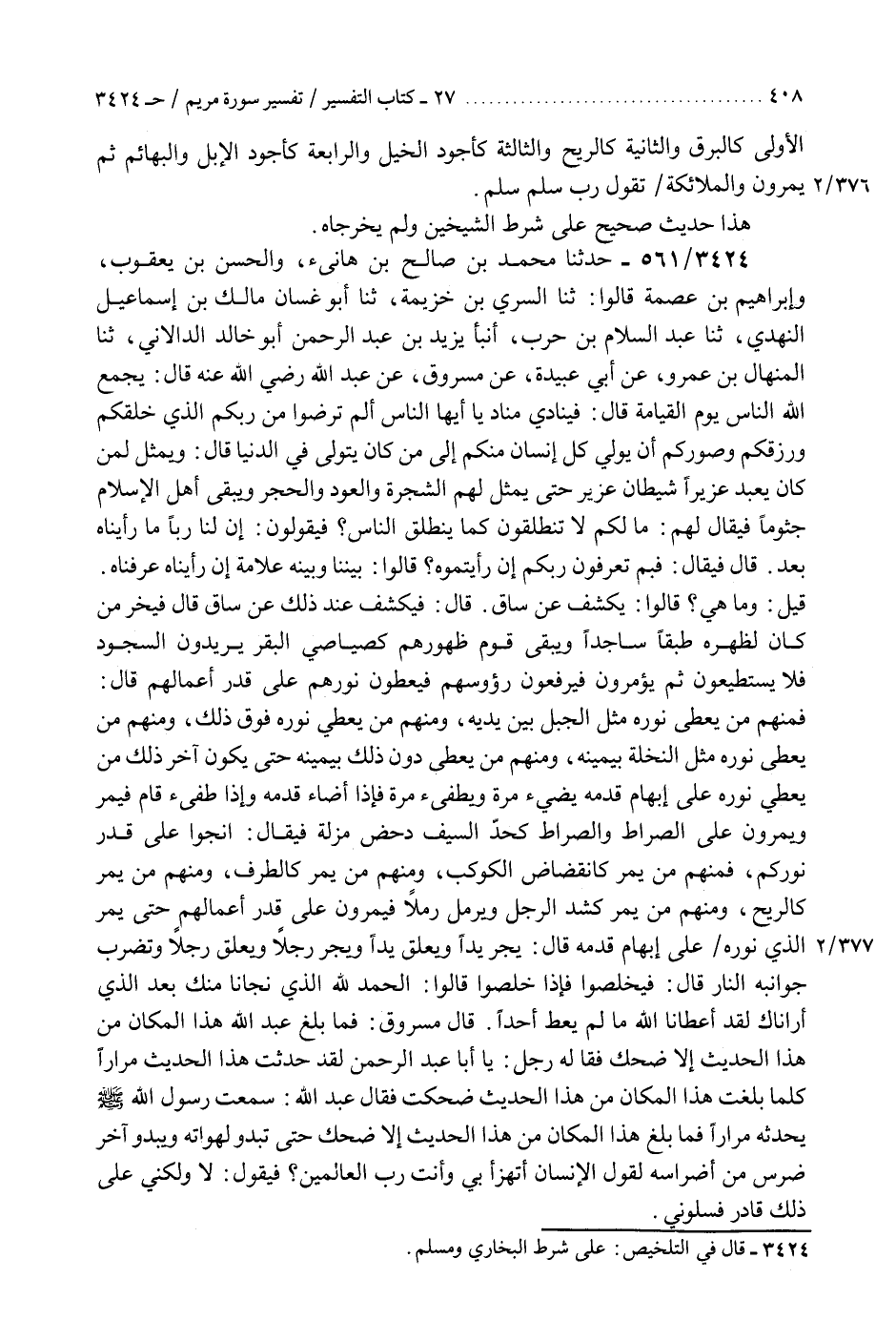 3424 - حَدَّثَنَا مُحَمَّدُ بْنُ صَالِحِ بْنِ هَانِئٍ، وَالْحَسَنُ بْنُ يَعْقُوبَ، وَإِبْرَاهِيمُ بْنُ عِصْمَةَ، قَالُوا: ثنا السَّرِيُّ بْنُ خُزَيْمَةَ، ثنا أَبُو غَسَّانَ مَالِكُ بْنُ إِسْمَاعِيلَ النَّهْدِيُّ، ثنا عَبْدُ السَّلَامِ بْنُ حَرْبٍ، أَنْبَأَ يَزِيدُ بْنُ عَبْدِ الرَّحْمَنِ أَبُو خَالِدٍ الدَّالَانِيُّ، حَدَّثَنَا الْمِنْهَالُ بْنُ عَمْرٍو، عَنْ أَبِي عُبَيْدَةَ، عَنْ مَسْرُوقٍ، عَنْ عَبْدِ اللَّهِ رَضِيَ اللَّهُ عَنْهُ، قَالَ: " §يَجْمَعُ اللَّهُ النَّاسَ يَوْمَ الْقِيَامَةِ، قَالَ: فَيُنَادِي مُنَادٍ: يَا أَيُّهَا النَّاسُ أَلَمْ تَرْضَوْا مِنْ رَبِّكُمُ الَّذِي خَلَقَكُمْ وَرَزَقَكُمْ وَصَوَّرَكُمْ، أَنْ يُوَلِّيَ كُلَّ إِنْسَانٍ مِنْكُمْ إِلَى مَنْ كَانَ يَتَوَلَّى فِي الدُّنْيَا؟ قَالَ: وَيُمَثَّلُ لِمَنْ كَانَ يَعْبُدُ عُزَيْرًا شَيْطَانُ عُزَيْرٍ حَتَّى يُمَثِّلَ لَهُمُ الشَّجَرَةَ وَالْعَوْدَ وَالْحَجَرَ، وَيَبْقَى أَهْلُ الْإِسْلَامِ جُثُومًا، فَيُقَالُ لَهُمْ: مَا لَكُمْ لَا تَنْطَلِقُونَ كَمَا يَنْطَلِقُ النَّاسُ؟، فَيَقُولُونَ: إِنَّ لَنَا رِبًّا مَا رَأَيْنَاهُ بَعْدُ، قَالَ: فَيُقَالُ: فَبِمَ تَعْرِفُونَ رَبَّكُمْ إِنْ رَأَيْتُمُوهُ؟ قَالُوا: بَيْنَنَا وَبَيْنَهُ عَلَامَةٌ، إِنْ رَأَيْنَاهُ عَرَفْنَاهُ، قِيلَ: وَمَا هِيَ؟، قَالُوا: يَكْشِفُ عَنْ سَاقٍ، قَالَ: فَيُكْشَفُ عِنْدَ ذَلِكَ عَنْ سَاقٍ قَالَ: فَيَخِرُّونَ مَنْ كَانَ لِظَهْرِهِ طَبَقًا سَاجِدًا، وَيَبْقَى قَوْمٌ ظُهُورُهُمْ كَصَيَاصِيِّ الْبَقَرِ يُرِيدُونَ السُّجُودَ فَلَا يَسْتَطِيعُونَ، ثُمَّ يُؤْمَرُونَ فَيَرْفَعُونَ رُءُوسَهُمْ فَيُعْطَوْنَ نُورَهُمْ عَلَى قَدْرِ أَعْمَالِهِمْ قَالَ: فَمِنْهُمْ مَنْ يُعْطَى نُورَهُ مِثْلَ الْجَبَلِ بَيْنَ يَدَيْهِ، وَمِنْهُمْ مَنْ يُعْطَى نُورَهُ فَوْقَ ذَلِكَ، وَمِنْهُمْ مَنْ يُعْطَى نُورَهُ مِثْلَ النَّخْلَةِ بِيَمِينِهِ، وَمِنْهُمْ مَنْ يُعْطَى دُونَ ذَلِكَ بِيَمِينِهِ حَتَّى يَكُونَ آخِرُ ذَلِكَ مَنْ يُعْطَى نُورَهُ عَلَى إِبْهَامِ قَدَمِهِ يُضِيءُ مَرَّةً، وَيُطْفِئُ مَرَّةً، فَإِذَا أَضَاءَ قَدَمُهُ، وَإِذَا طُفِئَ قَامَ فَيَمُرُّ وَيَمُرُّونَ عَلَى الصِّرَاطِ وَالصِّرَاطُ كَحَدِّ السَّيْفِ دَحْضُ مَزِلَّةٍ فَيُقَالُ: انْجُوا عَلَى قَدْرِ نُورِكُمْ، فَمِنْهُمْ مَنْ يَمُرُّ كَانْقِضَاضِ الْكَوْكَبِ، وَمِنْهُمْ مَنْ يَمُرُّ كَالطَّرْفِ، وَمِنْهُمْ مَنْ يَمُرُّ كَالرِّيحِ، وَمِنْهُمْ مَنْ يَمُرُّ كَشَدِّ الرَّجُلِ، وَيَرْمُلُ رَمَلًا، فَيَمُرُّونَ عَلَى قَدْرِ أَعْمَالِهِمْ حَتَّى يَمُرَّ الَّذِي نُورُهُ عَلَى إِبْهَامِ قَدَمِهِ قَالَ: يَجُرُّ يَدًا وَيُعَلِّقُ يَدًا وَيَجُرُّ رِجْلًا وَيُعَلِّقُ رِجْلًا وَتَضْرِبُ جَوَانِبَهُ النَّارُ، قَالَ: فَيَخْلَصُوا فَإِذَا خَلَصُوا قَالُوا: الْحَمْدُ لِلَّهِ الَّذِي نَجَّانَا مِنْكِ بَعْدَ الَّذِي أَرَانَاكِ لَقَدْ أَعْطَانَا اللَّهُ مَا لَمْ يُعْطِ أَحَدًا " قَالَ مَسْرُوقٌ: فَمَا بَلَغَ عَبْدُ اللَّهِ هَذَا الْمَكَانَ مِنْ هَذَا الْحَدِيثِ إِلَّا ضَحِكَ فَقَالَ لَهُ رَجُلٌ: يَا أَبَا عَبْدِ الرَّحْمَنِ لَقَدْ حَدَّثْتَ هَذَا الْحَدِيثَ مِرَارًا كُلَّمَا بَلَغْتَ هَذَا الْمَكَانَ مِنْ هَذَا الْحَدِيثِ ضَحِكْتَ، فَقَالَ عَبْدُ اللَّهِ سَمِعْتُ رَسُولَ اللَّهِ صَلَّى اللهُ عَلَيْهِ وَسَلَّمَ يُحَدِّثُهُ مِرَارًا، فَمَا بَلَغَ هَذَا الْمَكَانَ مِنْ هَذَا الْحَدِيثِ إِلَّا ضَحِكَ حَتَّى تَبْدُوَ لَهَوَاتُهُ وَيَبْدُو آخِرُ ضِرْسٍ مِنْ أَضْرَاسِهِ لِقَوْلِ الْإِنْسَانِ: أَتَهْزَأُ بِي وَأَنْتَ رَبُّ الْعَالَمِينَ؟ فَيَقُولُ: لَا، وَلَكِنِّي عَلَى ذَلِكَ قَادِرٌ فَسَلُونِي «هَذَا ح