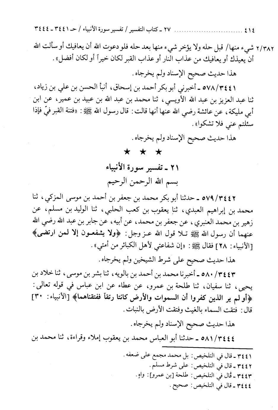 3442 - حَدَّثَنَا أَبُو بَكْرٍ مُحَمَّدُ بْنُ جَعْفَرِ بْنِ أَحْمَدَ بْنِ مُوسَى الْمُزَكِّي، ثنا مُحَمَّدُ بْنُ إِبْرَاهِيمَ الْعَبْدِيُّ، ثنا يَعْقُوبُ بْنُ كَعْبٍ الْحَلَبِيُّ، حَدَّثَنَا الْوَلِيدُ بْنُ مُسْلِمٍ، عَنْ زُهَيْرِ بْنِ مُحَمَّدٍ الْعَنْبَرِيُّ، عَنْ جَعْفَرِ بْنِ مُحَمَّدٍ، عَنْ أَبِيهِ، عَنْ جَابِرِ بْنِ عَبْدِ اللَّهِ رَضِيَ اللَّهُ عَنْهُمَا، أَنَّ رَسُولَ اللَّهِ صَلَّى اللهُ عَلَيْهِ وَسَلَّمَ تَلَا قَوْلَ اللَّهِ عَزَّ وَجَلَّ {وَلَا يَشْفَعُونَ إِلَّا لِمَنِ ارْتَضَى} [الأنبياء: 28] فَقَالَ صَلَّى اللهُ عَلَيْهِ وَسَلَّمَ: §«إِنَّ شَفَاعَتِي لِأَهْلِ الْكَبَائِرِ مِنْ أُمَّتِي» هَذَا حَدِيثٌ صَحِيحٌ عَلَى شَرْطِ الشَّيْخَيْنِ وَلَمْ يُخْرِجَاهُ "K3442 - على شرط مسلم