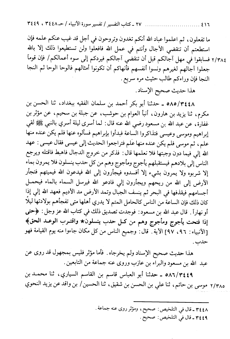 3448 - حَدَّثَنَا أَبُو بَكْرٍ أَحْمَدُ بْنُ سَلْمَانَ الْفَقِيهُ بِبَغْدَادَ، ثنا الْحَسَنُ بْنُ مُكْرَمٍ، ثنا يَزِيدُ بْنُ هَارُونَ، أَنْبَأَ الْعَوَّامُ بْنُ حَوْشَبٍ، عَنْ جَبَلَةَ بْنِ سُحَيْمٍ، عَنْ مُؤْثِرِ بْنِ غِفَارَةَ، عَنْ عَبْدِ اللَّهِ بْنِ مَسْعُودٍ رَضِيَ اللَّهُ عَنْهُ، قَالَ: " لَمَّا أُسْرِيَ لَيْلَةَ أُسْرِيَ بِالنَّبِيِّ صَلَّى اللهُ عَلَيْهِ وَسَلَّمَ لَقِيَ إِبْرَاهِيمَ، وَمُوسَى، وَعِيسَى فَتَذَاكَرُوا السَّاعَةَ فَبَدَءُوا بِإِبْرَاهِيمَ فَسَأَلُوهُ عَنْهَا، فَلَمْ يَكُنْ عِنْدَهُ مِنْهَا عِلْمٌ، ثُمَّ مُوسَى، فَلَمْ يَكُنْ عِنْدَهُ مِنْهَا عِلْمٌ، فَتَرَاجَعُوا الْحَدِيثَ إِلَى عِيسَى، فَقَالَ عِيسَى: " §عَهِدَ اللَّهُ إِلَيَّ فِيمَا دُونَ وَجْبَتِهَا فَلَا نَعْلَمُهَا، قَالَ: فَذَكَرَ مِنْ خُرُوجِ الدَّجَّالِ، فَأَهْبِطُ فَاقْتُلُهُ، وَيَرْجِعُ النَّاسُ إِلَى بِلَادِهِمْ فَيَسْتَقْبِلُهُمْ يَأْجُوجُ وَمَأْجُوجُ وَهُمْ مِنْ كُلِّ حَدَبٍ يَنْسِلُونَ، فَلَا يَمُرُّونَ بِمَاءٍ إِلَّا شَرِبُوهُ وَلَا يَمُرُّونَ بِشَيْءٍ إِلَّا أَفْسَدُوهُ فَيَجْأَرُونَ إِلَى اللَّهِ فَيَدْعُونَ اللَّهَ فَيُمِيتُهُمْ فَتَجْأَرُ الْأَرْضُ إِلَى اللَّهِ مِنْ رِيحِهِمْ وَيَجْأَرُونَ إِلَيَّ، فَأَدْعُوا اللَّهَ فَيُرْسِلُ السَّمَاءَ بِالْمَاءِ فَيَحْمِلُ أَجْسَامَهُمْ فَيَقْذِفُهَا فِي الْبَحْرِ، ثُمَّ يَنْسِفُ الْجِبَالَ، وَتُمَدُّ الْأَرْضُ مَدَّ الْأَدِيمِ فَعَهِدَ اللَّهُ إِلَيَّ إِذَا كَانَ ذَلِكَ، فَإِنَّ السَّاعَةَ مِنَ النَّاسِ كَالْحَامِلِ الْمُتِمِّ لَا يَدْرِي أَهْلُهَا مَتَى تَفْجَأُهُمْ بِوِلَادَتِهَا لَيْلًا أَوْ نَهَارًا " قَالَ عَبْدُ اللَّهِ بْنُ مَسْعُودٍ: فَوَجَدْتُ تَصْدِيقَ ذَلِكَ فِي كِتَابِ اللَّهِ عَزَّ وَجَلَّ {حَتَّى إِذَا فُتِحَتْ يَأْجُوجُ وَمَأْجُوجُ وَهُمْ مِنْ كُلِّ حَدَبٍ يَنْسِلُونَ وَاقْتَرَبَ الْوَعْدُ الْحَقُّ} [الأنبياء: 97] الْآيَةُ، قَالَ: وَجَمِيعُ النَّاسِ مِنْ كُلِّ مَكَانٍ جَاءُوا مِنْهُ يَوْمَ الْقِيَامَةِ فَهُوَ حَدَبٌ «هَذَا حَدِيثٌ صَحِيحُ الْإِسْنَادِ وَلَمْ يُخْرِجَاهُ» فَأَمَّا مُؤْثِرِ فَلَيْسَ بِمَجْهُولٍ " قَدْ رُوِيَ عَنْ عَبْدِ اللَّهِ بْنِ مَسْعُودٍ وَالْبَرَاءِ بْنِ عَازِبٍ وَرَوَى عَنْهُ جَمَاعَةٌ مِنَ التَّابِعِينَK3448 - صحيح