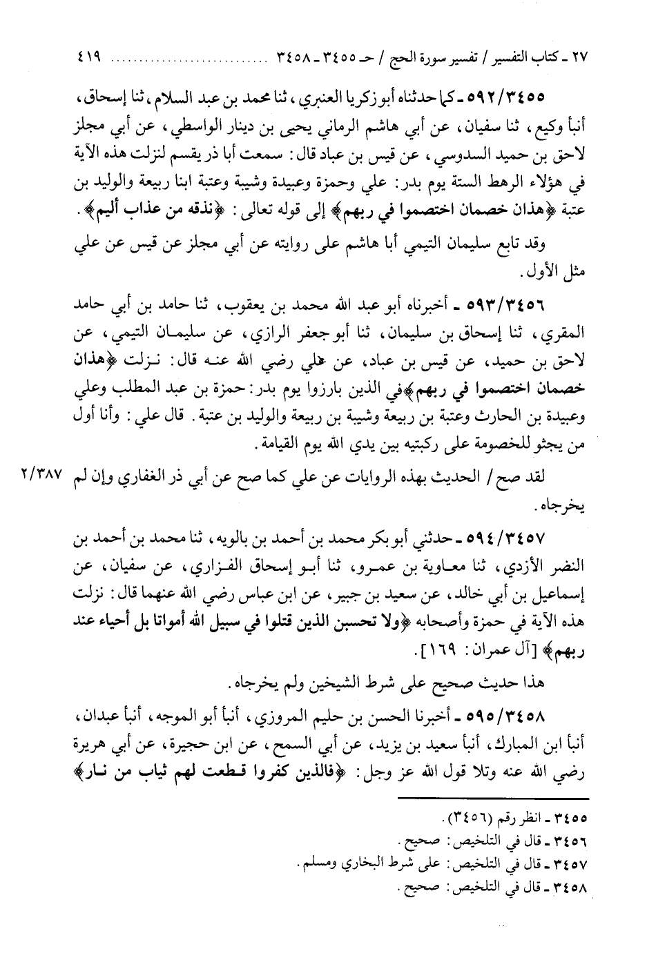 3456 - أَخْبَرَنَاهُ أَبُو عَبْدِ اللَّهِ مُحَمَّدُ بْنُ يَعْقُوبَ، ثنا حَامِدُ بْنُ أَبِي حَامِدٍ الْمُقْرِئُ، ثنا إِسْحَاقُ بْنُ سُلَيْمَانَ، ثنا أَبُو جَعْفَرٍ الرَّازِيُّ، عَنْ سُلَيْمَانَ التَّيْمِيِّ، عَنْ لَاحِقِ بْنِ حُمَيْدٍ، عَنْ قَيْسِ بْنِ عَبَّادٍ، عَنْ عَلِيٍّ رَضِيَ اللَّهُ عَنْهُ، قَالَ: §نَزَلَتْ {هَذَانِ خَصْمَانِ اخْتَصَمُوا فِي رَبِّهِمْ} [الحج: 19] فِي الَّذِينَ بَارَزُوا يَوْمَ بَدْرٍ: حَمْزَةُ بْنُ عَبْدِ الْمُطَّلِبِ، وَعَلِيٌّ، وَعُبَيْدَةُ بْنُ الْحَارِثِ، وَعُتْبَةُ بْنُ رَبِيعَةَ وَشَيْبَةُ بْنُ رَبِيعَةَ وَالْوَلِيدُ بْنُ عُتْبَةَ " قَالَ عَلِيٌّ: وَأَنَا أَوَّلُ مَنْ يَجْثُو لِلْخُصُومَةِ عَلَى رُكْبَتَيْهِ بَيْنَ يَدَيِ اللَّهِ يَوْمَ الْقِيَامَةِ «لَقَدْ صَحَّ الْحَدِيثُ بِهَذِهِ الرِّوَايَاتِ عَنْ عَلِيٍّ كَمَا صَحَّ عَنْ أَبِي ذَرٍّ الْغِفَارِيِّ وَإِنْ لَمْ يُخْرِجَاهُ» K3456 - صحيح