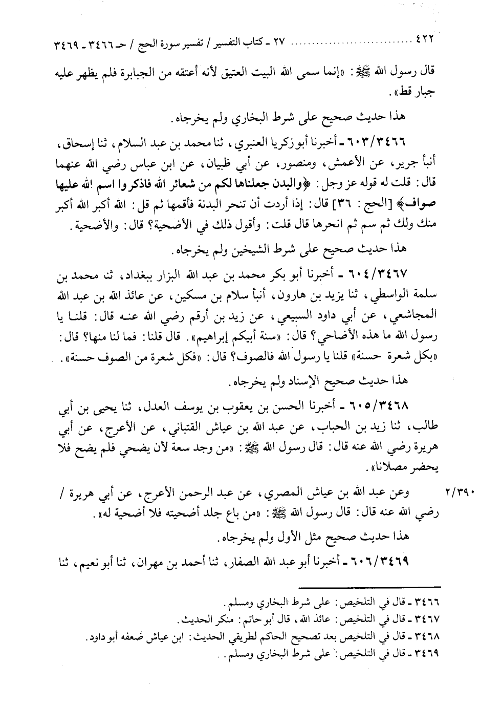 3466 - أَخْبَرَنَا أَبُو زَكَرِيَّا الْعَنْبَرِيُّ، ثنا مُحَمَّدُ بْنُ عَبْدِ السَّلَامِ، ثنا إِسْحَاقُ، أَنْبَأَ جَرِيرٌ، عَنِ الْأَعْمَشِ، وَمَنْصُورٍ، عَنْ أَبِي ظَبْيَانَ، عَنِ ابْنِ عَبَّاسٍ رَضِيَ اللَّهُ عَنْهُمَا، قَالَ: قُلْتُ لَهُ: قَوْلُهُ عَزَّ وَجَلَّ: {§وَالْبُدْنَ جَعَلْنَاهَا لَكُمْ مِنْ شَعَائِرِ اللَّهِ لَكُمْ فِيهَا خَيْرٌ فَاذْكُرُوا اسْمَ اللَّهِ عَلَيْهَا صَوَافَّ} [الحج: 36] قَالَ: " إِذَا أَرَدْتَ أَنْ تَنْحَرَ الْبَدَنَةَ فَأَقِمْهَا، ثُمَّ قُلِ: اللَّهُ أَكْبَرُ اللَّهُ أَكْبَرُ مِنْكَ وَلَكَ، ثُمَّ سَمِّ، ثُمَّ انْحَرْهَا ". قَالَ: قُلْتُ: وَأَقُولُ ذَلِكَ فِي الْأُضْحِيَّةِ؟ قَالَ: «وَالْأُضْحِيَّةِ» هَذَا حَدِيثٌ صَحِيحٌ عَلَى شَرْطِ الشَّيْخَيْنِ وَلَمْ يُخْرِجَاهُ "K3466 - على شرط البخاري ومسلم