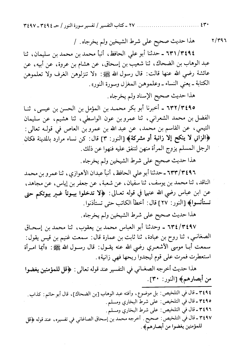 3496 - حَدَّثَنَا أَبُو عَلِيٍّ الْحَافِظُ، أَنْبَأَ عَبْدَانُ الْأَهْوَازِيُّ، ثنا عَمْرُو بْنُ مُحَمَّدٍ النَّاقِدُ، ثنا مُحَمَّدُ بْنُ يُوسُفَ، ثنا سُفْيَانُ، عَنْ شُعْبَةَ، عَنْ جَعْفَرِ بْنِ إِيَاسٍ، عَنْ مُجَاهِدٍ، عَنِ ابْنِ عَبَّاسٍ رَضِيَ اللَّهُ عَنْهُمَا فِي قَوْلِهِ تَعَالَى: {§لَا تَدْخُلُوا بُيُوتًا غَيْرَ بُيُوتِكُمْ حَتَّى تَسْتَأْنِسُوا} [النور: 27] قَالَ: «أَخْطَأَ الْكَاتِبُ حَتَّى تَسْتَأْذِنُوا» هَذَا حَدِيثٌ صَحِيحٌ عَلَى شَرْطِ الشَّيْخَيْنِ وَلَمْ يُخْرِجَاهُ "K3496 - على شرط البخاري ومسلم