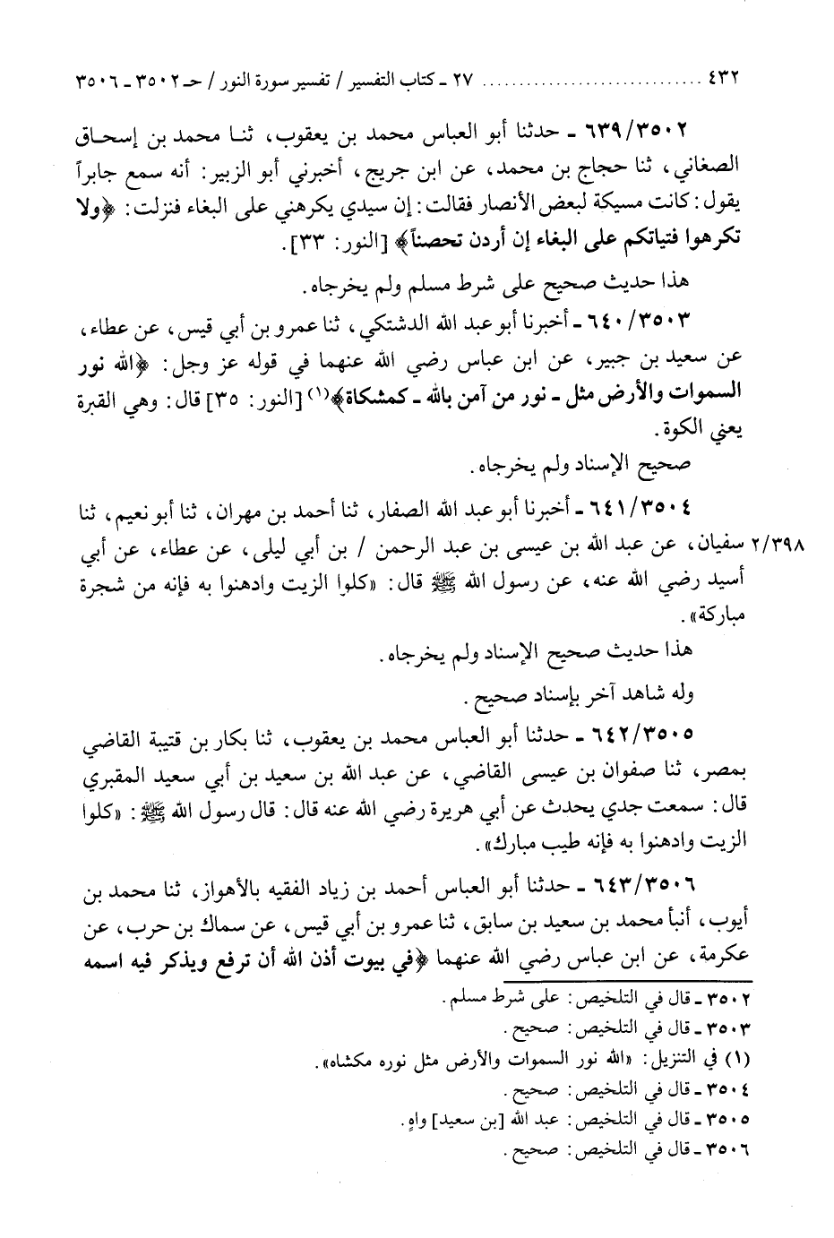 3502 - حَدَّثَنَا أَبُو الْعَبَّاسِ مُحَمَّدُ بْنُ يَعْقُوبَ، ثنا مُحَمَّدُ بْنُ إِسْحَاقَ الصَّغَانِيُّ، ثنا حَجَّاجُ بْنُ مُحَمَّدٍ، عَنِ ابْنِ جُرَيْجٍ، أَخْبَرَنِي أَبُو الزُّبَيْرِ، أَنَّهُ سَمِعَ جَابِرًا، يَقُولُ: " §كَانَتْ مُسَيْكَةُ لِبَعْضِ الْأَنْصَارِ فَقَالَتْ: إِنَّ سَيِّدِي يُكْرِهُنِي عَلَى الْبِغَاءِ، فَنَزَلَتْ: {وَلَا تُكْرِهُوا فَتَيَاتِكُمْ عَلَى الْبِغَاءِ إِنْ أَرَدْنَ تَحَصُّنًا} [النور: 33] «هَذَا حَدِيثٌ صَحِيحٌ عَلَى شَرْطِ مُسْلِمٍ وَلَمْ يُخْرِجَاهُ» K3502 - على شرط مسلم