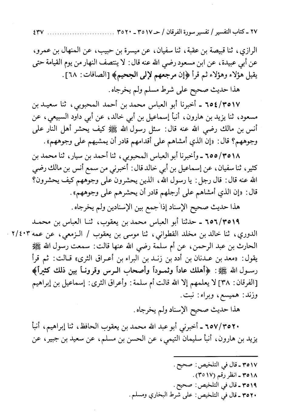 3517 - أَخْبَرَنَا أَبُو الْعَبَّاسِ مُحَمَّدُ بْنُ أَحْمَدَ الْمَحْبُوبِيُّ، ثنا سَعِيدُ بْنُ مَسْعُودٍ، ثنا يَزِيدُ بْنُ هَارُونَ، أَنْبَأَ إِسْمَاعِيلُ بْنُ أَبِي خَالِدٍ، عَنْ أَبِي دَاوُدَ السَّبِيعِيِّ، عَنْ أَنَسِ بْنِ مَالِكٍ رَضِيَ اللَّهُ عَنْهُ، قَالَ: سُئِلَ رَسُولُ اللَّهِ صَلَّى اللهُ عَلَيْهِ وَسَلَّمَ: كَيْفَ يُحْشَرُ أَهْلُ النَّارِ عَلَى وُجُوهَهِمْ؟ قَالَ: §«إِنَّ الَّذِي أَمْشَاهُمْ عَلَى أَقْدَامِهِمْ قَادِرٌ أَنْ يُمْشِيَهُمُ عَلَى وُجُوهِهِمْ» K3517 - صحيح