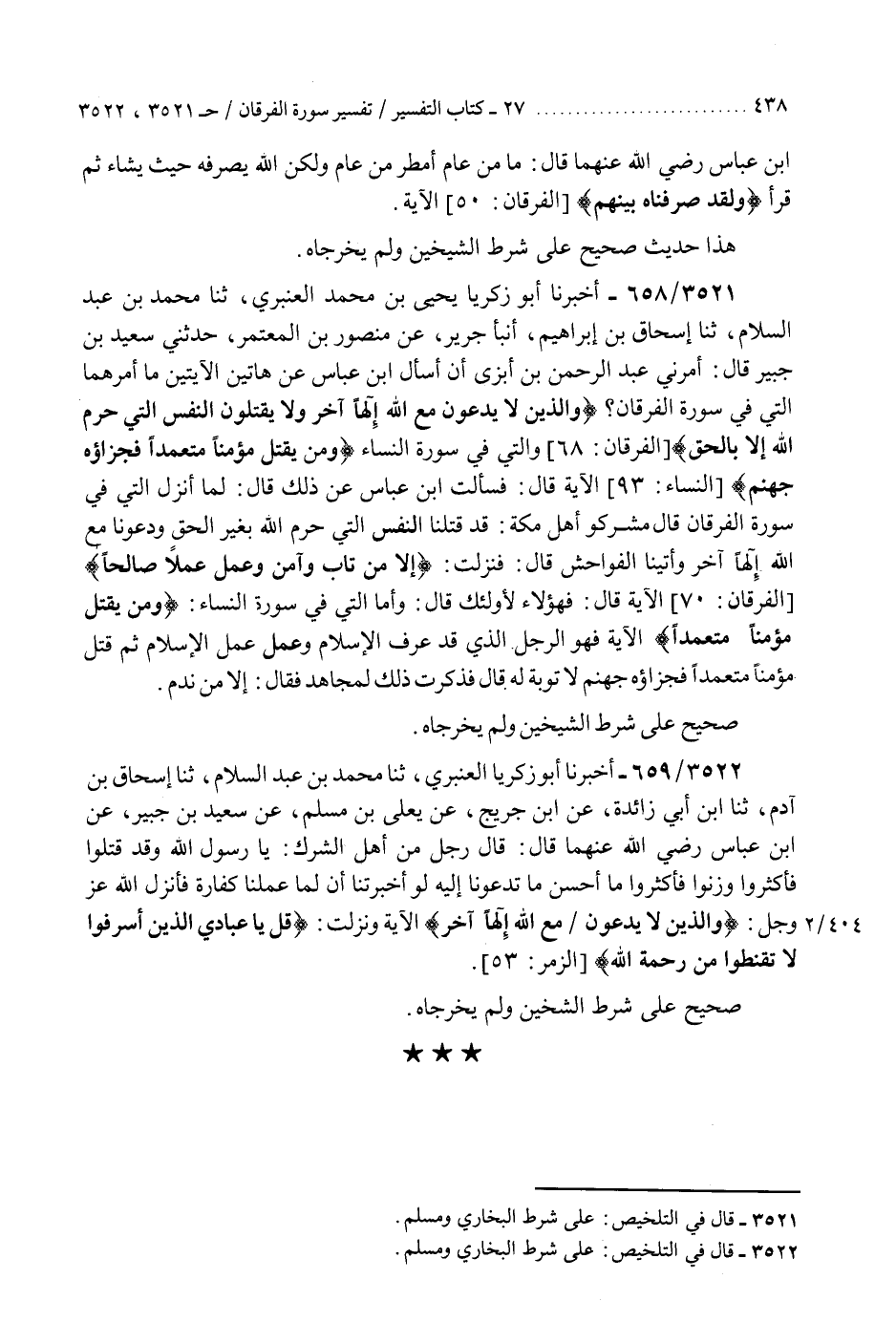 3521 - أَخْبَرَنَا أَبُو زَكَرِيَّا يَحْيَى بْنُ مُحَمَّدٍ الْعَنْبَرِيُّ، ثنا مُحَمَّدُ بْنُ عَبْدِ السَّلَامِ، ثنا إِسْحَاقُ بْنُ إِبْرَاهِيمَ، أَنْبَأَ جَرِيرٌ، عَنْ مَنْصُورِ بْنِ الْمُعْتَمِرِ، حَدَّثَنِي سَعِيدُ بْنُ جُبَيْرٍ، قَالَ: أَمَرَنِي عَبْدُ الرَّحْمَنِ بْنُ أَبْزَى أَنْ أَسْأَلَ ابْنَ عَبَّاسٍ، عَنْ هَاتَيْنِ الْآيَتَيْنِ مَا أَمْرُهُمَا الَّتِي فِي سُورَةِ الْفُرْقَانِ: {وَالَّذِينَ لَا يَدْعُونَ مَعَ اللَّهِ إِلَهًا آخَرَ وَلَا يَقْتُلُونَ النَّفْسَ الَّتِي حَرَّمَ اللَّهُ إِلَّا بِالْحَقِّ} [الفرقان: 68] ، وَالَّتِي فِي سُورَةِ النِّسَاءِ {وَمَنْ يَقْتُلْ مُؤْمِنًا مُتَعَمِّدًا فَجَزَاؤُهُ جَهَنَّمَ} [النساء: 93] الْآيَةُ. قَالَ: فَسَأَلْتُ ابْنَ عَبَّاسٍ عَنْ ذَلِكَ قَالَ: §«لَمَّا أَنْزَلَ الَّتِي فِي سُورَةِ الْفُرْقَانِ قَالَ مُشْرِكُوا أَهْلِ مَكَّةَ قَدْ قَتَلْنَا النَّفْسَ الَّتِي حَرَّمَ اللَّهُ بِغَيْرِ الْحَقِّ وَدَعَوْنَا مَعَ اللَّهِ إِلَهًا آخَرَ وَأَتَيْنَا الْفَوَاحِشَ» قَالَ: فَنَزَلَتْ {إِلَّا مَنْ تَابَ وَآمَنَ وَعَمِلَ عَمَلًا صَالِحًا} [الفرقان: 70] الْآيَةَ. قَالَ: «فَهَؤُلَاءِ لِأُولَئِكَ» قَالَ: " وَأَمَّا الَّتِي فِي سُورَةِ النِّسَاءِ {وَمَنْ يَقْتُلْ مُؤْمِنًا مُتَعَمِّدًا} [النساء: 93] الْآيَةُ فَهُوَ الرَّجُلُ الَّذِي قَدْ عَرَفَ الْإِسْلَامَ وَعَمِلَ عَمَلَ الْإِسْلَامِ، ثُمَّ قَتَلَ مُؤْمِنًا مُتَعَمِّدًا فَجَزَاؤُهُ جَهَنَّمَ لَا تَوْبَةَ لَهُ. قَالَ: فَذَكَرْتُ ذَلِكَ لِمُجَاهِدٍ فَقَالَ: إِلَّا مَنْ نَدِمَ «صَحِيحٌ عَلَى شَرْطِ الشَّيْخَيْنِ وَلَمْ يُخْرِجَاهُ» K3521 - على شرط البخاري ومسلم