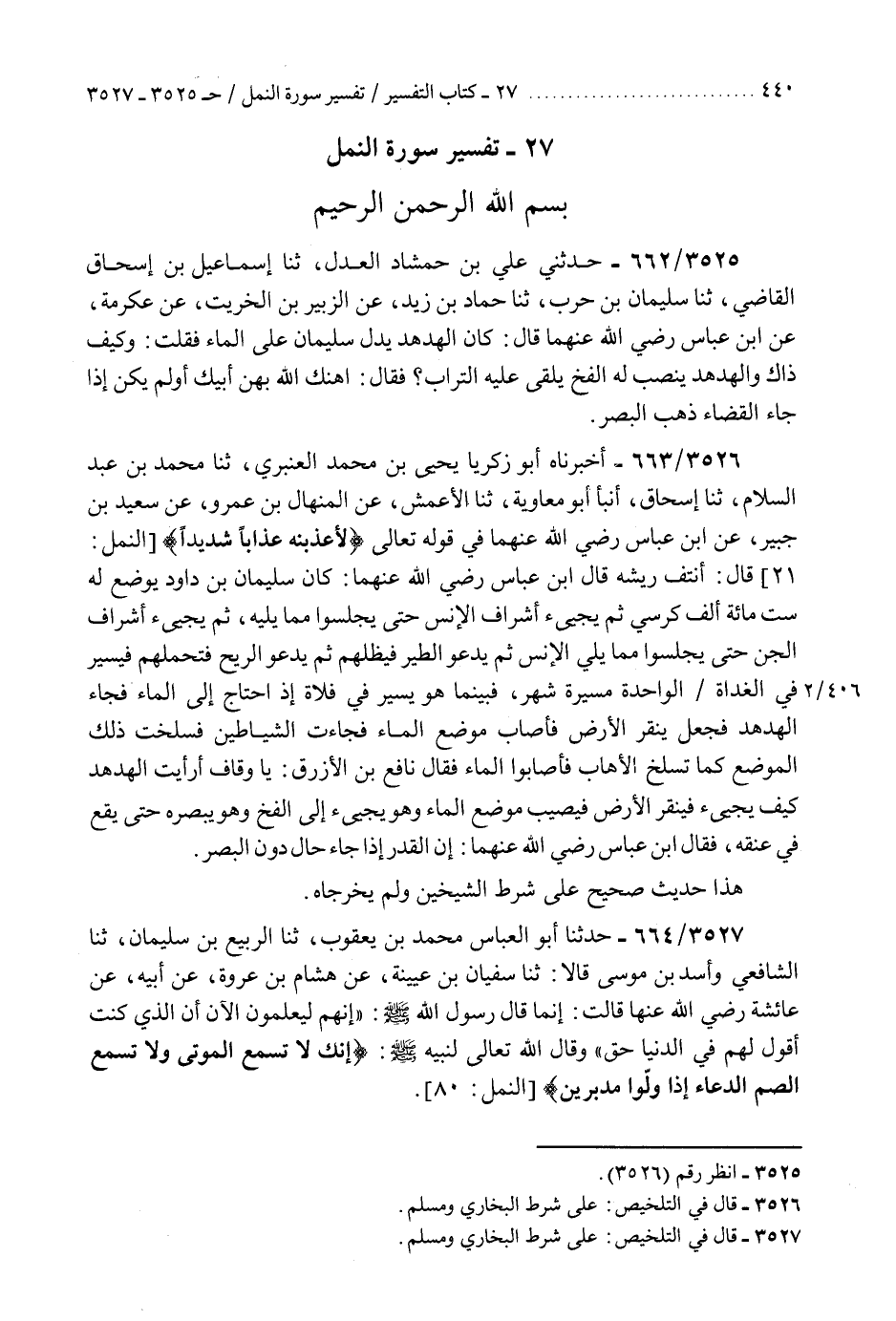 3526 - أَخْبَرَنَاهُ أَبُو زَكَرِيَّا يَحْيَى بْنُ مُحَمَّدٍ الْعَنْبَرِيُّ، ثنا مُحَمَّدُ بْنُ عَبْدِ السَّلَامِ، ثنا إِسْحَاقُ، أَنْبَأَ أَبُو مُعَاوِيَةَ، ثنا الْأَعْمَشُ، عَنِ الْمِنْهَالِ بْنِ عَمْرٍو، عَنْ سَعِيدِ بْنِ جُبَيْرٍ، عَنِ ابْنِ عَبَّاسٍ رَضِيَ اللَّهُ عَنْهُمَا، فِي قَوْلِهِ تَعَالَى: {لَأُعَذِّبَنَّهُ عَذَابًا شَدِيدًا} [النمل: 21] قَالَ: «أَنْتُفُ رِيشَهُ» . قَالَ ابْنُ عَبَّاسٍ رَضِيَ اللَّهُ عَنْهُمَا: §«كَانَ سُلَيْمَانُ بْنُ دَاوُدَ يُوضَعُ لَهُ سِتُّ مِائَةِ أَلْفِ كُرْسِيٍّ، ثُمَّ يَجِيءُ أَشْرَافُ الْإِنْسِ حَتَّى يَجْلِسُوا مِمَّا يَلِيهِ، ثُمَّ يَجِيءُ أَشْرَافُ الْجِنِّ حَتَّى يَجْلِسُوا مِمَّا يَلِي الْإِنْسَ، ثُمَّ يَدْعُو الطَّيْرَ فَيُظِلُّهُمْ، ثُمَّ يَدْعُو الرِّيحَ فَتَحْمِلُهُمْ، فَيَسِيرُ فِي الْغَدَاةِ الْوَاحِدَةِ مَسِيرَةَ شَهْرٍ فَبَيْنَمَا هُوَ يَسِيرُ فِي فَلَاةٍ إِذِ احْتَاجَ إِلَى الْمَاءِ فَجَاءَ الْهُدْهُدُ فَجَعَلَ يَنْقُرُ الْأَرْضَ فَأَصَابَ مَوْضِعَ الْمَاءَ، فَجَاءَتِ الشَّيَاطِينُ فَسَلَخَتْ ذَلِكَ الْمَوْضِعَ كَمَا تَسْلُخُ الْإِهَابَ فَأَصَابُوا الْمَاءَ» فَقَالَ نَافِعُ بْنُ الْأَزْرَقِ: يَا وَقَّافُ، أَرَأَيْتَ الْهُدْهُدَ كَيْفَ يَجِيءُ فَيَنْقُرُ الْأَرْضَ فَيُصِيبُ مَوْضِعَ الْمَاءَ وَهُوَ يَجِيءُ إِلَى الْفَخِّ وَهُوَ يُبْصِرُهُ حَتَّى يَقَعَ فِي عُنُقِهِ؟ فَقَالَ ابْنُ عَبَّاسٍ رَضِيَ اللَّهُ عَنْهُمَا: «إِنَّ الْقَدْرَ إِذَا جَاءَ حَالَ دُونَ الْبَصَرِ» هَذَا حَدِيثٌ صَحِيحٌ عَلَى شَرْطِ الشَّيْخَيْنِ وَلَمْ يُخْرِجَاهُ "K3526 - على شرط البخاري ومسلم