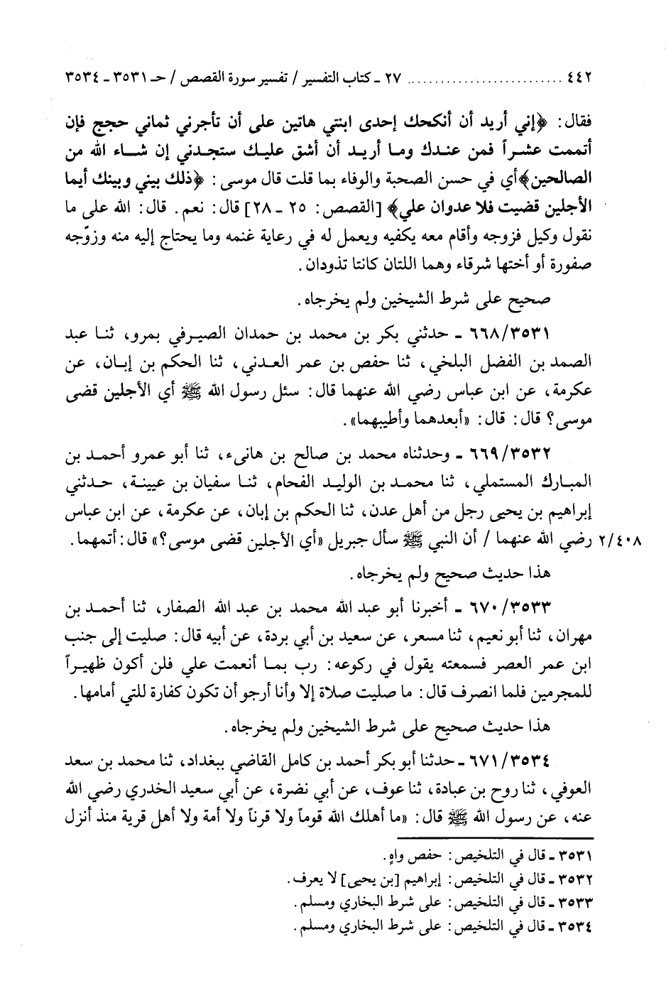 3532 - وَحَدَّثَنَاهُ مُحَمَّدُ بْنُ صَالِحِ بْنِ هَانِئٍ، ثنا أَبُو عَمْرٍو أَحْمَدُ بْنُ الْمُبَارَكِ الْمُسْتَمْلِي، ثنا مُحَمَّدُ بْنُ الْوَلِيدِ الْفَحَّامُ، ثنا سُفْيَانُ بْنُ عُيَيْنَةَ، حَدَّثَنِي إِبْرَاهِيمُ بْنُ يَحْيَى، رَجُلٌ مِنْ أَهْلِ عَدَنٍ، ثنا الْحَكَمُ بْنُ أَبَانَ، عَنْ عِكْرِمَةَ، عَنِ ابْنِ عَبَّاسٍ رَضِيَ اللَّهُ عَنْهُمَا، أَنَّ النَّبِيَّ صَلَّى اللهُ عَلَيْهِ وَسَلَّمَ سَأَلَ جِبْرِيلَ: " §أَيَّ الْأَجَلَيْنِ قَضَى مُوسَى؟ قَالَ: «أَتَمَّهُمَا» هَذَا حَدِيثٌ صَحِيحٌ وَلَمْ يُخْرِجَاهُ "K3532 - إبراهيم بن يحيى لا يعرف