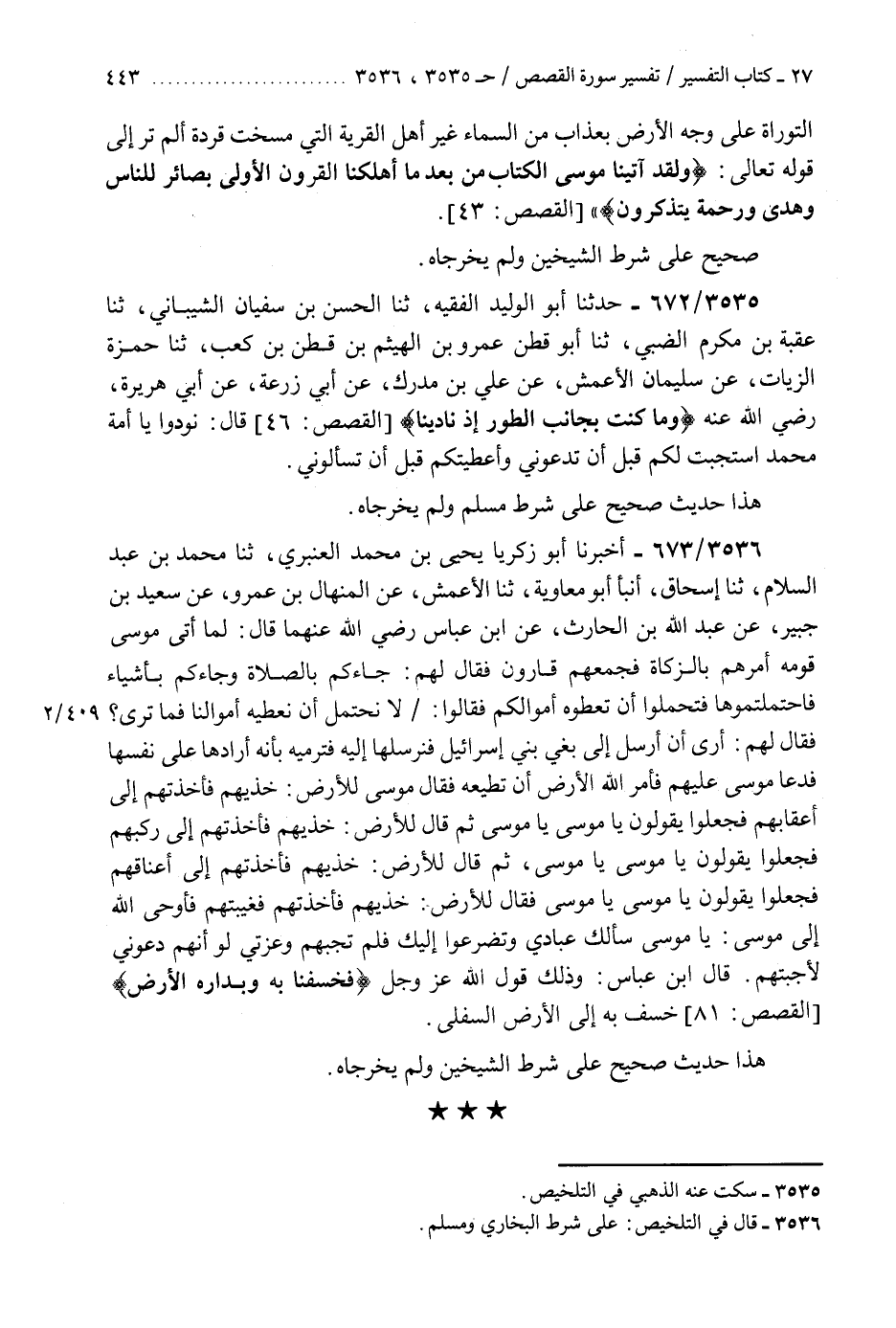 3536 - أَخْبَرَنَا أَبُو زَكَرِيَّا يَحْيَى بْنُ مُحَمَّدٍ الْعَنْبَرِيُّ، ثنا مُحَمَّدُ بْنُ عَبْدِ السَّلَامِ، ثنا إِسْحَاقُ، أَنْبَأَ أَبُو مُعَاوِيَةَ، ثنا الْأَعْمَشُ، عَنِ الْمِنْهَالِ بْنِ عَمْرٍو، عَنْ سَعِيدِ بْنِ جُبَيْرٍ، عَنْ عَبْدِ اللَّهِ بْنِ الْحَارِثِ، عَنِ ابْنِ عَبَّاسٍ رَضِيَ اللَّهُ عَنْهُمَا، قَالَ: §لَمَّا أَتَى مُوسَى قَوْمَهُ أَمَرَهُمْ بِالزَّكَاةِ فَجَمَعَهُمْ قَارُونُ فَقَالَ لَهُمْ: «جَاءَكُمْ بِالصَّلَاةِ وَجَاءَكُمْ بِأَشْيَاءَ فَاحْتَمَلْتُمُوهَا فَتَحَمَّلُوا أَنْ تُعْطُوهُ أَمْوَالَكُمْ» . فَقَالُوا: لَا نَحْتَمِلُ أَنْ نُعْطِيَهُ أَمْوَالَنَا فَمَا تَرَى؟ فَقَالَ لَهُمْ: " أَرَى أَنْ أُرْسِلَ إِلَى بَغِيِّ بَنِي إِسْرَائِيلَ فَنُرْسِلَهَا إِلَيْهِ فَتَرْمِيَهُ بِأَنَّهُ أَرَادَهَا عَلَى نَفْسِهَا، فَدَعَا مُوسَى عَلَيْهِمْ فَأَمَرَ اللَّهُ الْأَرْضَ أَنْ تُطِيعَهُ، فَقَالَ مُوسَى لِلْأَرْضِ: خُذِيهِمْ فَأَخَذَتْهُمْ إِلَى أَعْقَابِهِمْ " فَجَعَلُوا يَقُولُونَ: يَا مُوسَى يَا مُوسَى، ثُمَّ قَالَ لِلْأَرْضِ: «خُذِيهِمْ فَأَخَذَتْهُمْ إِلَى رُكَبِهِمْ» فَجَعَلُوا يَقُولُونَ: يَا مُوسَى يَا مُوسَى، ثُمَّ قَالَ: «لِلْأَرْضِ خُذِيهِمْ فَأَخَذَتْهُمْ إِلَى أَعْنَاقِهِمْ» فَجَعَلُوا يَقُولُونَ: يَا مُوسَى يَا مُوسَى فَقَالَ لِلْأَرْضِ: " خُذِيهِمْ فَأَخَذَتْهُمْ فَغَيَّبَتْهُمْ، فَأَوْحَى اللَّهُ إِلَى مُوسَى يَا مُوسَى سَأَلَكَ عِبَادِي وَتَضَرَّعُوا إِلَيْكَ فَلَمْ تُجِبْهُمْ، وَعِزَّتِي لَوْ أَنَّهُمْ دَعَوْنِي لَأَجَبْتُهُمْ، قَالَ ابْنُ عَبَّاسٍ: وَذَلِكَ قَوْلُ اللَّهِ عَزَّ وَجَلَّ {فَخَسَفْنَا بِهِ وَبِدَارِهِ الْأَرْضَ} [القصص: 81] خُسِفَ بِهِ إِلَى الْأَرْضِ السُّفْلَى «هَذَا حَدِيثٌ صَحِيحٌ عَلَى شَرْطِ الشَّيْخَيْنِ وَلَمْ يُخْرِجَاهُ» K3536 - على شرط البخاري ومسلم