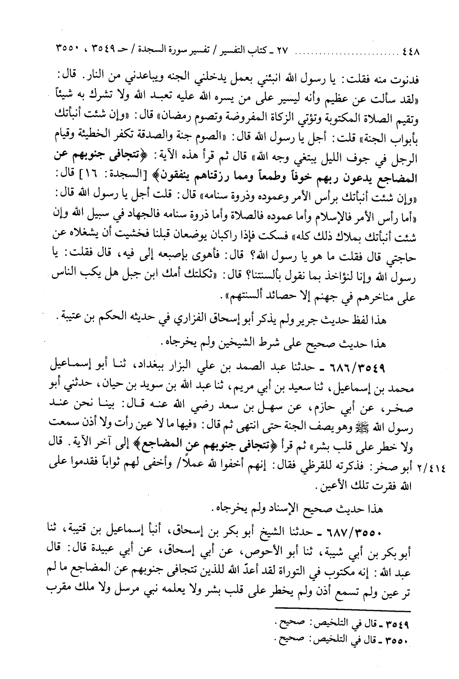 3549 - حَدَّثَنَا عَبْدُ الصَّمَدِ بْنُ عَلِيٍّ الْبَزَّارِ، بِبَغْدَادَ، ثنا أَبُو إِسْمَاعِيلَ مُحَمَّدُ بْنُ إِسْمَاعِيلَ، ثنا سَعِيدُ بْنُ أَبِي مَرْيَمَ، ثنا عَبْدُ اللَّهِ بْنُ سُوَيْدِ بْنِ حَيَّانَ، حَدَّثَنِي أَبُو صَخْرٍ، عَنْ أَبِي حَازِمٍ، عَنْ سَهْلِ بْنِ سَعْدٍ رَضِيَ اللَّهُ عَنْهُ، قَالَ: بَيْنَا نَحْنُ عِنْدَ رَسُولِ اللَّهِ صَلَّى اللهُ عَلَيْهِ وَسَلَّمَ وَهُوَ يَصِفُ الْجَنَّةَ حَتَّى انْتَهَى، ثُمَّ قَالَ: §" فِيهَا مَا لَا عَيْنٌ رَأَتْ وَلَا أُذُنٌ سَمِعَتْ وَلَا خَطَرَ عَلَى قَلْبِ بَشَرٍ، ثُمَّ قَرَأَ {تَتَجَافَى جُنُوبُهُمْ عَنِ الْمَضَاجِعِ} [السجدة: 16] إِلَى آخِرِ الْآيَةِ قَالَ أَبُو صَخْرٍ: فَذَكَرْتُهُ لِلْقُرَظِيِّ فَقَالَ: إِنَّهُمْ أَخْفَوْا لِلَّهِ عَمَلًا وَأَخْفَى لَهُمْ ثَوَابًا فَقَدِمُوا عَلَى اللَّهِ فَقَرَّتْ تِلْكَ الْأَعْيُنُ «هَذَا حَدِيثٌ صَحِيحُ الْإِسْنَادِ وَلَمْ يُخْرِجَاهُ» K3549 - صحيح