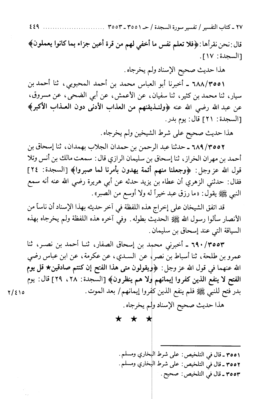 3553 - أَخْبَرَنِي مُحَمَّدُ بْنُ إِسْحَاقَ الصَّفَّارُ، ثنا أَحْمَدُ بْنُ نَصْرٍ، ثنا عَمْرُو بْنُ طَلْحَةَ، ثنا أَسْبَاطُ بْنُ نَصْرٍ، عَنِ السُّدِّيِّ، عَنْ عِكْرِمَةَ، عَنِ ابْنِ عَبَّاسٍ رَضِيَ اللَّهُ عَنْهُمَا، فِي قَوْلِ اللَّهِ عَزَّ وَجَلَّ: {§وَيَقُولُونَ مَتَى هَذَا الْفَتْحُ إِنْ كُنْتُمْ صَادِقِينَ قُلْ يَوْمَ الْفَتْحِ لَا يَنْفَعُ الَّذِينَ كَفَرُوا إِيمَانُهُمْ وَلَا هُمْ يُنْظَرُونَ} [السجدة: 29] قَالَ: «يَوْمُ بَدْرٍ فُتِحَ لِلنَّبِيِّ صَلَّى اللهُ عَلَيْهِ وَسَلَّمَ فَلَمْ يَنْفَعِ الَّذِينَ كَفَرُوا إِيمَانُهُمْ بَعْدَ الْمَوْتِ» هَذَا حَدِيثٌ صَحِيحُ الْإِسْنَادِ وَلَمْ يُخْرِجَاهُ "K3553 - صحيح