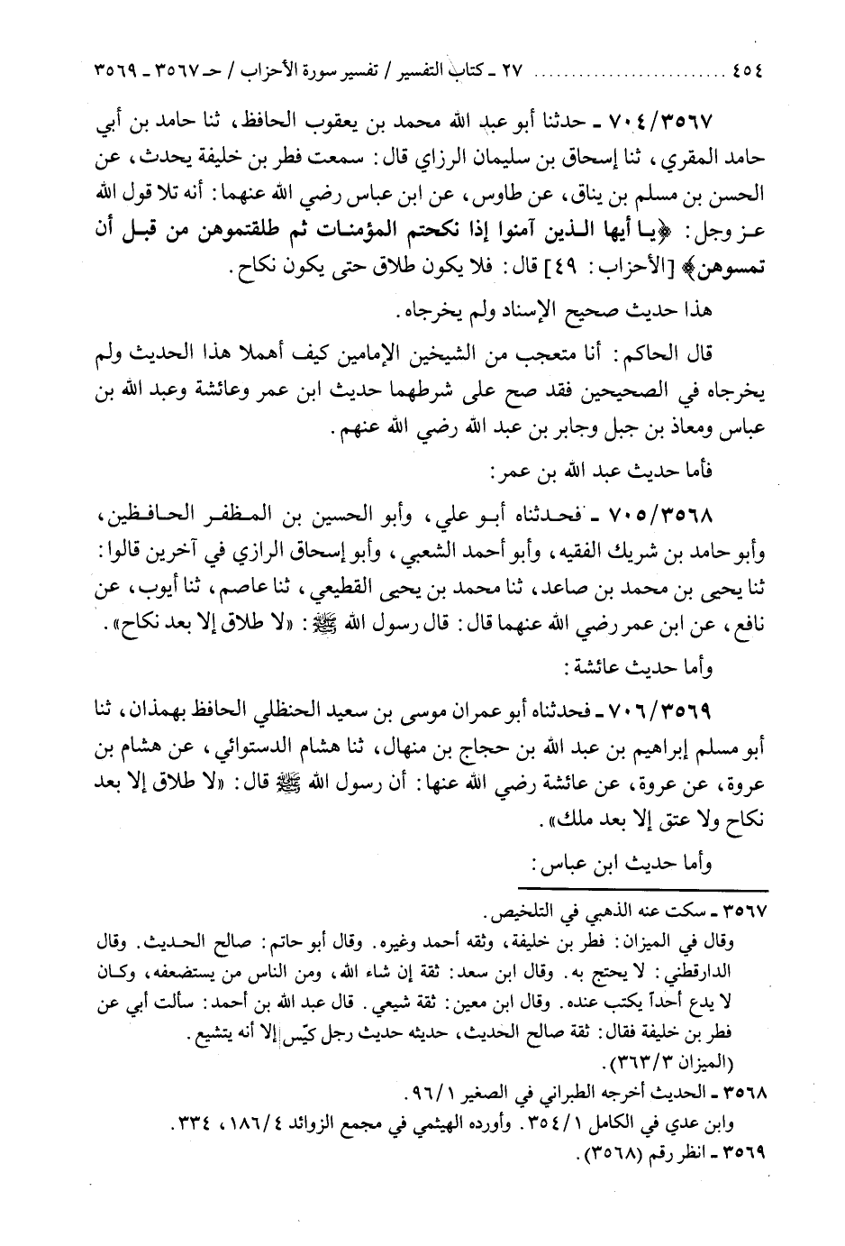 3567 - حَدَّثَنَا أَبُو عَبْدِ اللَّهِ مُحَمَّدُ بْنُ يَعْقُوبَ الْحَافِظُ، ثنا حَامِدُ بْنُ أَبِي حَامِدٍ الْمُقْرِئُ، ثنا إِسْحَاقُ بْنُ سُلَيْمَانَ الرَّازِيُّ، قَالَ: سَمِعْتُ فِطْرَ بْنَ خَلِيفَةَ، يُحَدِّثُ عَنِ الْحَسَنِ بْنِ مُسْلِمِ بْنِ يَنَّاقٍ، عَنْ طَاوُسٍ، عَنِ ابْنِ عَبَّاسٍ رَضِيَ اللَّهُ عَنْهُمَا، أَنَّهُ تَلَا قَوْلَ اللَّهِ تَعَالَى: {§يَا أَيُّهَا الَّذِينَ آمَنُوا إِذَا نَكَحْتُمُ الْمُؤْمِنَاتِ، ثُمَّ طَلَّقْتُمُوهُنَّ مِنْ قَبْلِ أَنْ تَمَسُّوهُنَّ} [الأحزاب: 49] قَالَ: «فَلَا يَكُونُ طَلَاقٌ حَتَّى يَكُونَ نِكَاحٌ» هَذَا حَدِيثٌ صَحِيحُ الْإِسْنَادِ وَلَمْ يُخْرِجَاهُ ". قَالَ الْحَاكِمُ: «أَنَا مُتَعَجِّبٌ مِنَ الشَّيْخَيْنِ الْإِمَامَيْنِ كَيْفَ أَهْمَلَا هَذَا الْحَدِيثَ وَلَمْ يُخْرِجَاهُ فِي الصَّحِيحَيْنِ فَقَدْ صَحَّ عَلَى شَرْطِهِمَا حَدِيثُ ابْنِ عُمَرَ وَعَائِشَةَ وَعَبْدِ اللَّهِ بْنِ عَبَّاسٍ وَمُعَاذِ بْنِ جَبَلٍ وَجَابِرِ بْنِ عَبْدِ اللَّهِ رَضِيَ اللَّهُ عَنْهُمْ، فَأَمَّا حَدِيثُ عَبْدِ اللَّهِ بْنِ عُمَرَ» K3567 - سكت عنه الذهبي في التلخيص