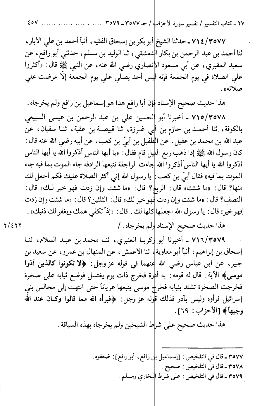 3577 - حَدَّثَنَا الشَّيْخُ أَبُو بَكْرِ بْنُ إِسْحَاقَ الْفَقِيهُ، أَنْبَأَ أَحْمَدُ بْنُ عَلِيٍّ الْأَبَّارُ، ثنا أَحْمَدُ بْنُ عَبْدِ الرَّحْمَنِ بْنِ بَكَّارٍ الدِّمَشْقِيُّ، ثنا الْوَلِيدُ بْنُ مُسْلِمٍ، حَدَّثَنِي أَبُو رَافِعٍ، عَنْ سَعِيدٍ الْمَقْبُرِيِّ، عَنْ أَبِي مَسْعُودٍ الْأَنْصَارِيِّ رَضِيَ اللَّهُ عَنْهُ، عَنِ النَّبِيِّ صَلَّى اللهُ عَلَيْهِ وَسَلَّمَ قَالَ: «§أَكْثِرُوا عَلَيَّ الصَّلَاةَ فِي يَوْمِ الْجُمُعَةِ، فَإِنَّهُ لَيْسَ أَحَدٌ يُصَلِّي عَلَيَّ يَوْمَ الْجُمُعَةِ إِلَّا عُرِضَتْ عَلَيَّ صَلَاتُهُ» هَذَا حَدِيثٌ صَحِيحُ الْإِسْنَادِ، فَإِنَّ أَبَا رَافِعٍ هَذَا هُوَ إِسْمَاعِيلُ بْنُ رَافِعٍ وَلَمْ يُخْرِجَاهُ "K3577 - إسماعيل بن رافع أبو رافع ضعفوه