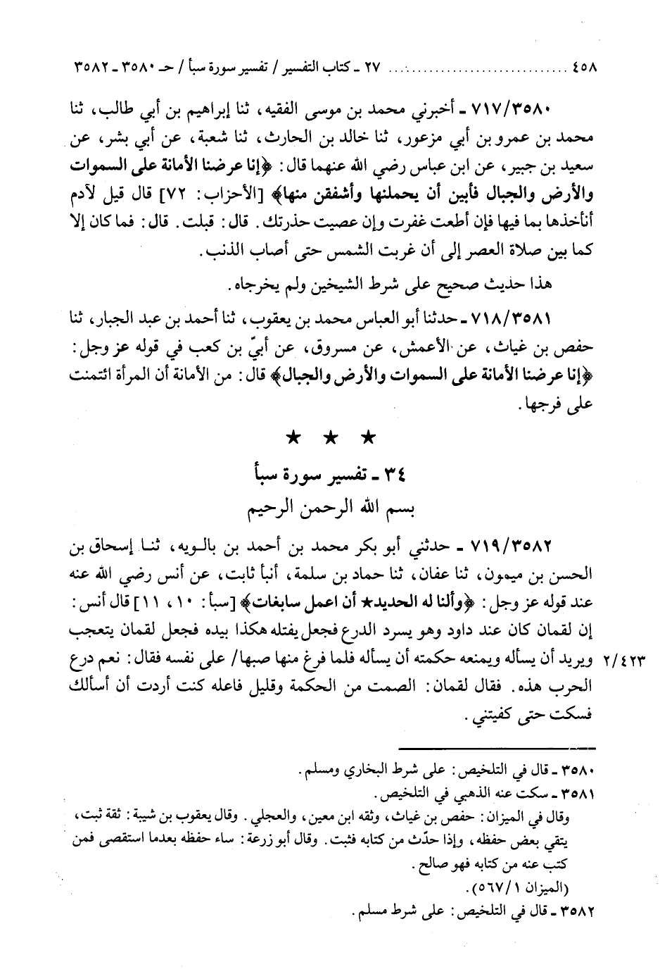 3580 - أَخْبَرَنِي مُحَمَّدُ بْنُ مُوسَى الْفَقِيهُ، ثنا إِبْرَاهِيمُ بْنُ أَبِي طَالِبٍ، ثنا مُحَمَّدُ بْنُ عَمْرِو بْنِ أَبِي مَزْعُورٍ، ثنا خَالِدُ بْنُ الْحَارِثِ، ثنا شُعْبَةُ، عَنْ أَبِي بِشْرٍ، عَنْ سَعِيدِ بْنِ جُبَيْرٍ، عَنِ ابْنِ عَبَّاسٍ رَضِيَ اللَّهُ عَنْهُمَا، قَالَ: {§إِنَّا عَرَضْنَا الْأَمَانَةَ عَلَى السَّمَوَاتِ وَالْأَرْضِ وَالْجِبَالِ فَأَبَيْنَ أَنْ يَحْمِلْنَهَا وَأَشْفَقْنَ مِنْهَا} قَالَ: " قِيلَ لِآدَمَ أَتَأْخُذُهَا بِمَا فِيهَا، فَإِنْ أَطَعْتَ غَفَرْتُ، وَإِنْ عَصَيْتَ حَذَّرْتُكَ؟ قَالَ: قَبِلْتُ. قَالَ: فَمَا كَانَ إِلَّا كَمَا بَيْنَ صَلَاةِ الْعَصْرِ إِلَى أَنْ غَرَبَتِ الشَّمْسُ حَتَّى أَصَابَ الذَّنْبَ " هَذَا حَدِيثٌ صَحِيحٌ عَلَى شَرْطِ الشَّيْخَيْنِ وَلَمْ يُخْرِجَاهُK3580 - على شرط البخاري ومسلم