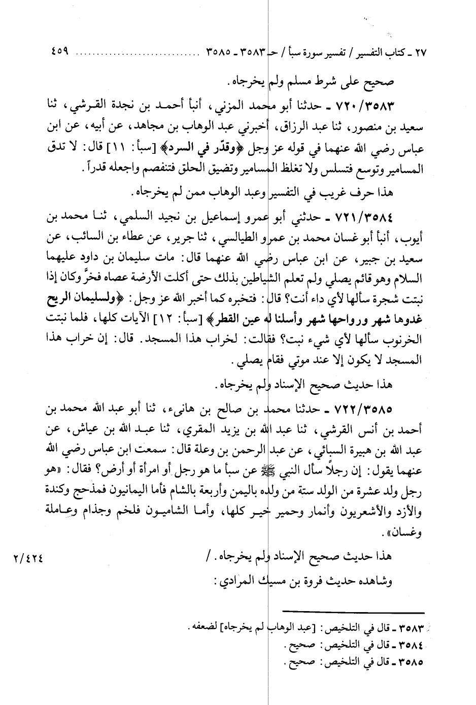 3585 - حَدَّثَنَا مُحَمَّدُ بْنُ صَالِحِ بْنِ هَانِئٍ، ثنا أَبُو عَبْدِ اللَّهِ مُحَمَّدُ بْنُ أَحْمَدَ بْنِ أَنَسٍ الْقُرَشِيُّ، ثنا عَبْدُ اللَّهِ بْنُ يَزِيدَ الْمُقْرِئُ، ثنا عَبْدُ اللَّهِ بْنُ عَيَّاشٍ، عَنْ عَبْدِ اللَّهِ بْنِ هُبَيْرَةَ السَّبَائِيِّ، عَنْ عَبْدِ الرَّحْمَنِ بْنِ وَعْلَةَ، قَالَ: سَمِعْتُ ابْنَ عَبَّاسٍ رَضِيَ اللَّهُ عَنْهُمَا، يَقُولُ: إِنَّ رَجُلًا سَأَلَ النَّبِيَّ صَلَّى اللهُ عَلَيْهِ وَسَلَّمَ عَنْ سَبَأٍ مَا هُوَ رَجُلٌ أَوِ امْرَأَةٌ أَوْ أَرْضٌ؟ فَقَالَ: §«هُوَ رَجُلٌ وَلَدَ عَشَرَةً مِنَ الْوَلَدِ سِتَّةً مِنْ وَلَدِهِ بِالْيَمَنِ وَأَرْبَعَةٌ بِالشَّامِ، فَأَمَّا الْيَمَانِيُّونَ فَمَذْحِجٌ، وَكِنْدَةُ، وَالْأَزْدُ، وَالْأَشْعَرِيُّونَ، وَأنْمَارُ، وَحِمْيَرُ خَيْرٌ كُلُّهَا، وَأَمَّا الشَّامِيُّونَ فَلَخْمٌ، وَجُذَامُ، وَعَامِلَةُ، وَغَسَّانُ» هَذَا حَدِيثٌ صَحِيحُ الْإِسْنَادِ وَلَمْ يُخْرِجَاهُ «وَشَاهِدُهُ حَدِيثُ فَرْوَةَ بْنِ مُسَيْكٍ الْمُرَادِيِّ» K3585 - صحيح