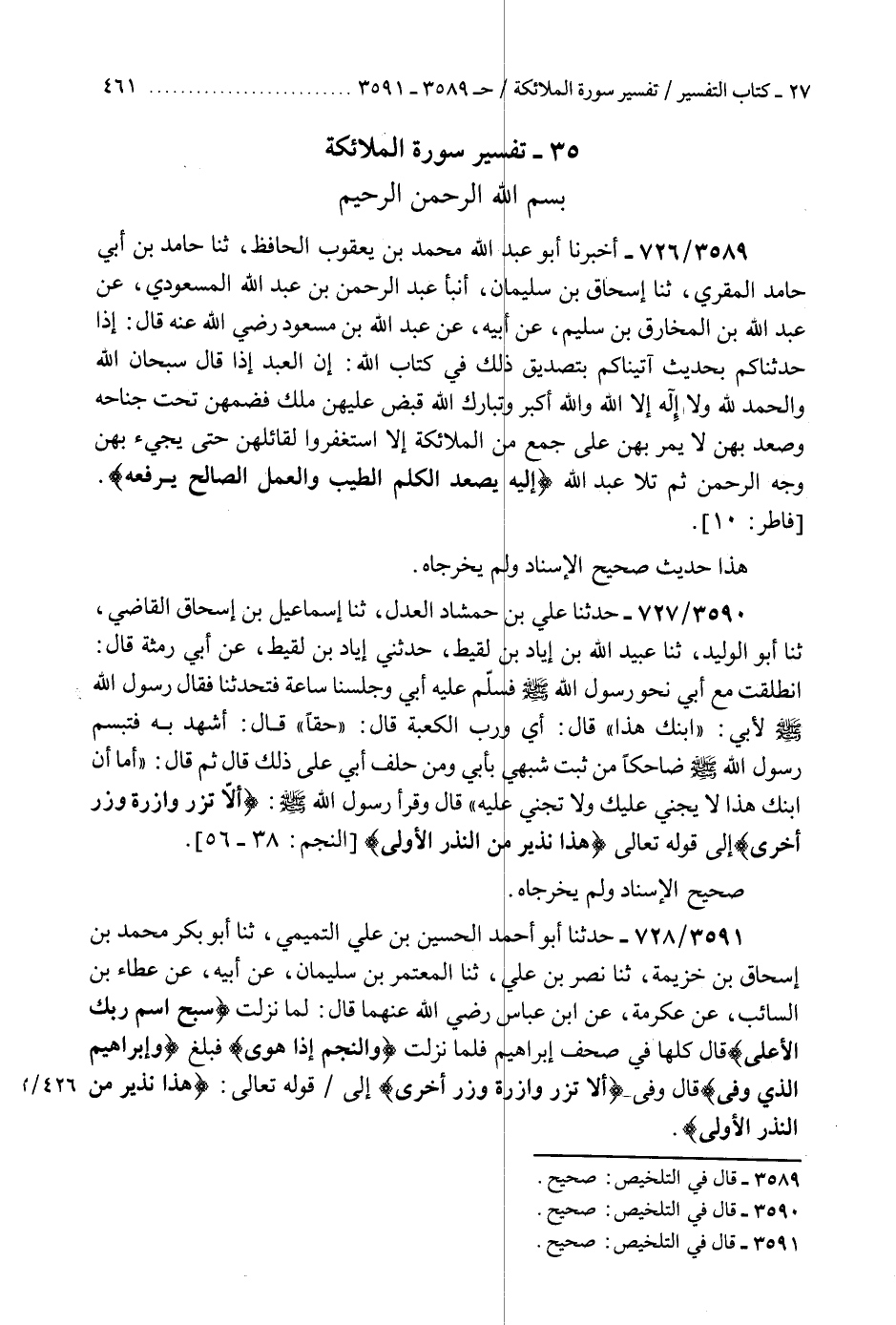 3589 - أَخْبَرَنَا أَبُو عَبْدِ اللَّهِ مُحَمَّدُ بْنُ يَعْقُوبَ الْحَافِظُ، ثنا حَامِدُ بْنُ أَبِي حَامِدٍ الْمُقْرِئُ، ثنا إِسْحَاقُ بْنُ سُلَيْمَانَ، أَنْبَأَ عَبْدُ الرَّحْمَنِ بْنُ عَبْدِ اللَّهِ الْمَسْعُودِيُّ، عَنْ عَبْدِ اللَّهِ بْنِ الْمُخَارِقِ بْنِ سُلَيْمٍ، عَنْ أَبِيهِ، عَنْ عَبْدِ اللَّهِ بْنِ مَسْعُودٍ رَضِيَ اللَّهُ عَنْهُ، قَالَ: §" إِذَا حَدَّثْنَاكُمْ بِحَدِيثٍ أَتَيْنَاكُمْ بِتَصْدِيقِ ذَلِكَ فِي كِتَابِ اللَّهِ إِنَّ الْعَبْدَ إِذَا قَالَ: سُبْحَانَ اللَّهِ وَالْحَمْدُ لِلَّهِ، وَلَا إِلَهَ إِلَّا اللَّهُ، وَاللَّهُ أَكْبَرُ، وَتَبَارَكَ اللَّهُ، قَبَضَ عَلَيْهِنَّ مَلَكٌ فَضَمَّهُنَّ تَحْتَ جَنَاحِهِ وَصَعِدَ بِهِنَّ لَا يَمُرُّ بِهِنَّ عَلَى جَمْعٍ مِنَ الْمَلَائِكَةِ إِلَّا اسْتَغْفَرُوا لِقَائِلِهِنَّ حَتَّى يَجِيءَ بِهِنَّ وَجْهَ الرَّحْمَنِ، ثُمَّ تَلَا عَبْدُ اللَّهِ {إِلَيْهِ يَصْعَدُ الْكَلِمُ الطَّيِّبُ وَالْعَمَلُ الصَّالِحُ يَرْفَعْهُ} [فاطر: 10] «هَذَا حَدِيثٌ صَحِيحُ الْإِسْنَادِ وَلَمْ يُخْرِجَاهُ» K3589 - صحيح