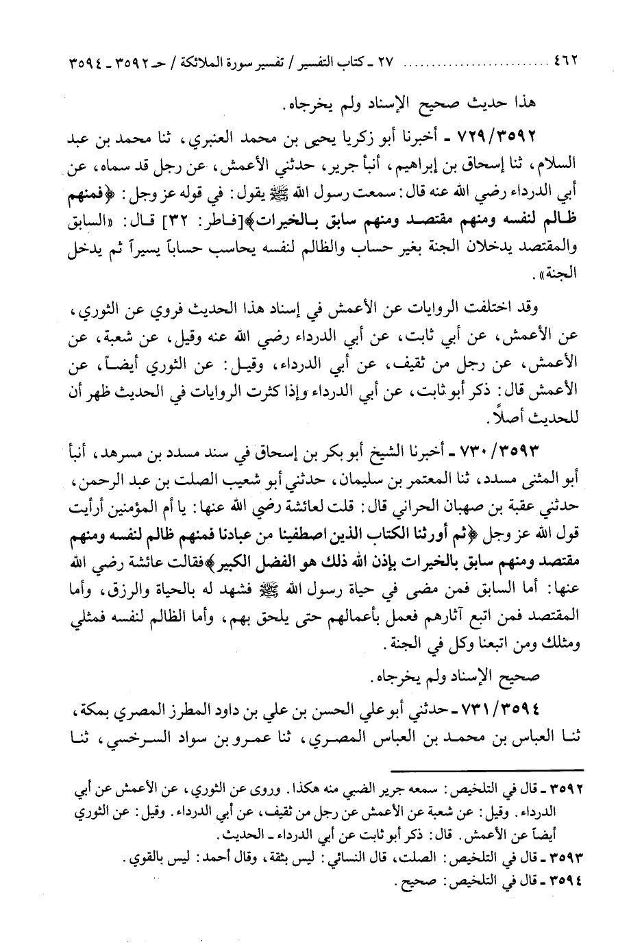 3592 - أَخْبَرَنَا أَبُو زَكَرِيَّا يَحْيَى بْنُ مُحَمَّدٍ الْعَنْبَرِيُّ، ثنا مُحَمَّدُ بْنُ عَبْدِ السَّلَامِ، ثنا إِسْحَاقُ بْنُ إِبْرَاهِيمَ، أَنْبَأَ جَرِيرٌ، حَدَّثَنِي الْأَعْمَشُ، عَنْ رَجُلٍ، قَدْ سَمَّاهُ عَنْ أَبِي الدَّرْدَاءِ رَضِيَ اللَّهُ عَنْهُ، قَالَ: سَمِعْتُ رَسُولَ اللَّهِ صَلَّى اللهُ عَلَيْهِ وَسَلَّمَ يَقُولُ فِي قَوْلِهِ عَزَّ وَجَلَّ: {§فَمِنْهُمْ ظَالِمٌ لِنَفْسِهِ وَمِنْهُمْ مُقْتَصِدٌ وَمِنْهُمْ سَابِقٌ بِالْخَيْرَاتِ} [فاطر: 32] قَالَ: «السَّابِقُ وَالْمُقْتَصِدُ يَدْخُلَانِ الْجَنَّةَ بِغَيْرِ حِسَابٍ وَالظَّالِمُ لِنَفْسِهِ يُحَاسَبُ حِسَابًا يَسِيرًا، ثُمَّ يَدْخُلُ الْجَنَّةَ» وَقَدِ اخْتَلَفَتِ الرِّوَايَاتُ عَنِ الْأَعْمَشِ فِي إِسْنَادِ هَذَا الْحَدِيثِ فَرُوِيَ عَنِ الثَّوْرِيِّ، عَنِ الْأَعْمَشِ، عَنْ أَبِي ثَابِتٍ، عَنْ أَبِي الدَّرْدَاءِ رَضِيَ اللَّهُ عَنْهُ. وَقِيلَ عَنْ شُعْبَةَ، عَنِ الْأَعْمَشِ، عَنْ رَجُلٍ مِنْ ثَقِيفٍ، عَنْ أَبِي الدَّرْدَاءِ. وَقِيلَ عَنِ الثَّوْرِيِّ أَيْضًا، عَنِ الْأَعْمَشِ قَالَ: ذَكَرَ أَبُو ثَابِتٍ، عَنْ أَبِي الدَّرْدَاءِ. «وَإِذَا كَثُرَتِ الرِّوَايَاتِ فِي الْحَدِيثِ ظَهَرَ أَنَّ لِلْحَدِيثِ أَصْلًا»