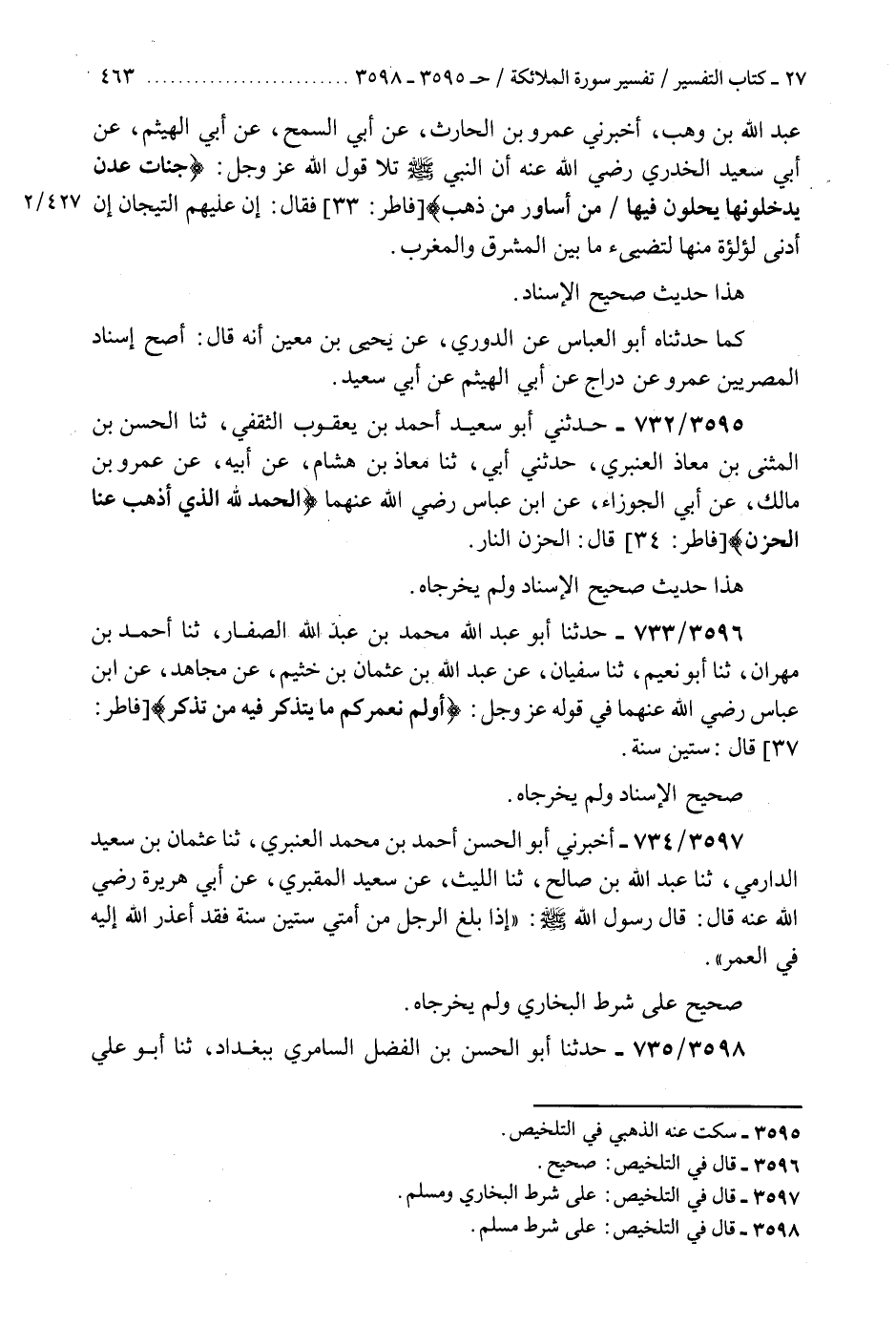 3595 - حَدَّثَنِي أَبُو سَعِيدٍ أَحْمَدُ بْنُ يَعْقُوبَ الثَّقَفِيُّ، ثنا الْحَسَنُ بْنُ الْمُثَنَّى بْنِ مُعَاذٍ الْعَنْبَرِيُّ، حَدَّثَنِي أَبِي، ثنا مُعَاذُ بْنُ هِشَامٍ، عَنْ أَبِيهِ، عَنْ عَمْرِو بْنِ مَالِكٍ، عَنْ أَبِي الْجَوْزَاءِ، عَنِ ابْنِ عَبَّاسٍ رَضِيَ اللَّهُ عَنْهُمَا، {§الْحَمْدُ لِلَّهِ الَّذِي أَذْهَبَ عَنَّا الْحَزَنَ} [فاطر: 34] قَالَ: «الْحَزَنُ النَّارُ» هَذَا حَدِيثٌ صَحِيحُ الْإِسْنَادِ وَلَمْ يُخْرِجَاهُ "K3595 - سكت عنه الذهبي في التلخيص
