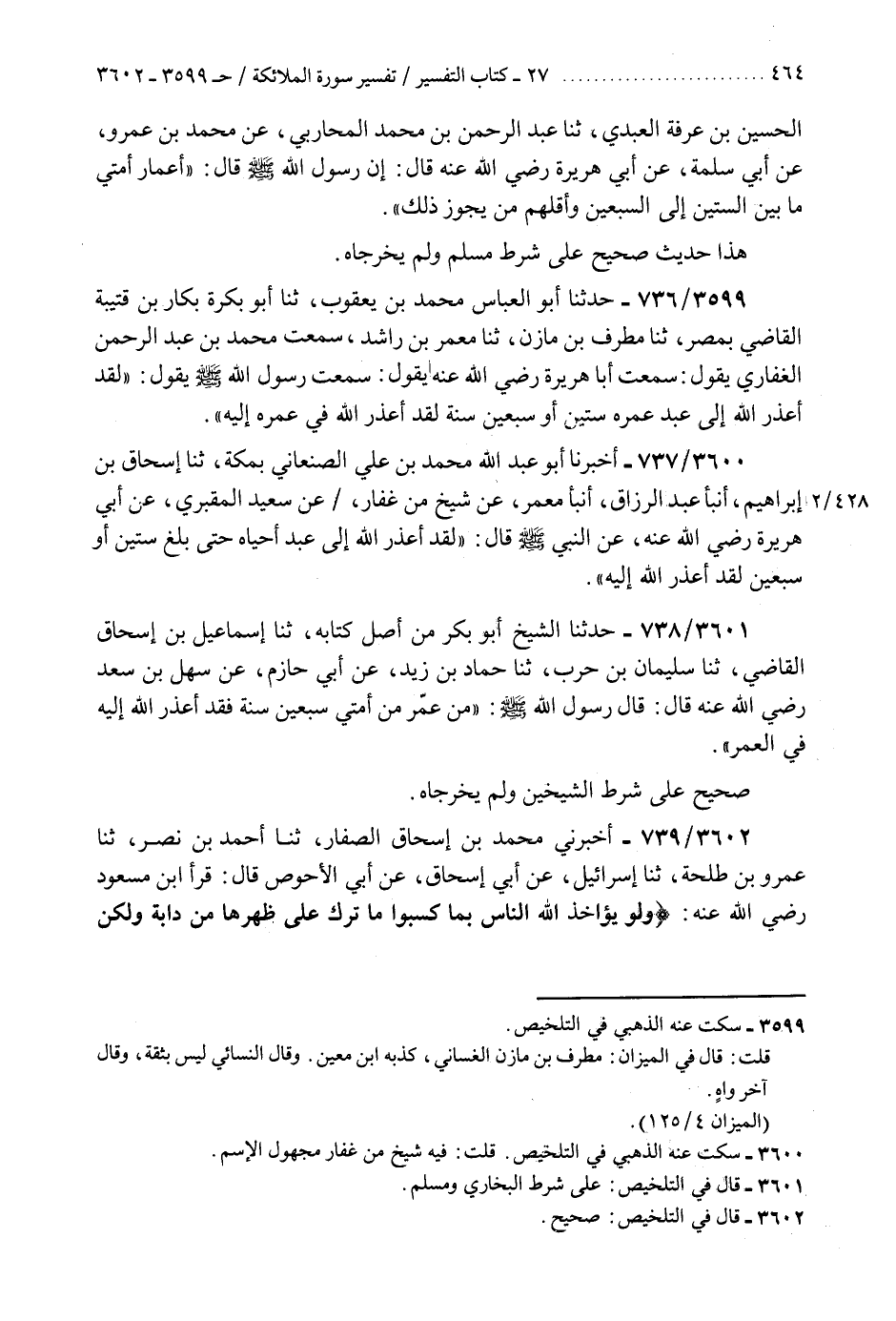 3599 - حَدَّثَنَا أَبُو الْعَبَّاسِ مُحَمَّدُ بْنُ يَعْقُوبَ، ثنا أَبُو بَكْرَةَ بَكَّارُ بْنُ قُتَيْبَةَ الْقَاضِي بِمِصْرَ، ثنا مُطَرِّفُ بْنُ مَازِنٍ، ثنا مَعْمَرُ بْنُ رَاشِدٍ، سَمِعْتُ مُحَمَّدَ بْنَ عَبْدِ الرَّحْمَنِ الْغِفَارِيَّ، يَقُولُ: سَمِعْتُ أَبَا هُرَيْرَةَ رَضِيَ اللَّهُ عَنْهُ، يَقُولُ: سَمِعْتُ رَسُولَ اللَّهِ صَلَّى اللهُ عَلَيْهِ وَسَلَّمَ يَقُولُ: §«لَقَدْ أَعْذَرَ اللَّهُ إِلَى عَبْدٍ عَمَّرَهُ سِتِّينَ أَوْ سَبْعِينَ سَنَةً، لَقَدْ أَعْذَرَ اللَّهُ فِي عُمُرِهِ إِلَيْهِ» K3599 - سكت عنه الذهبي في التلخيص
