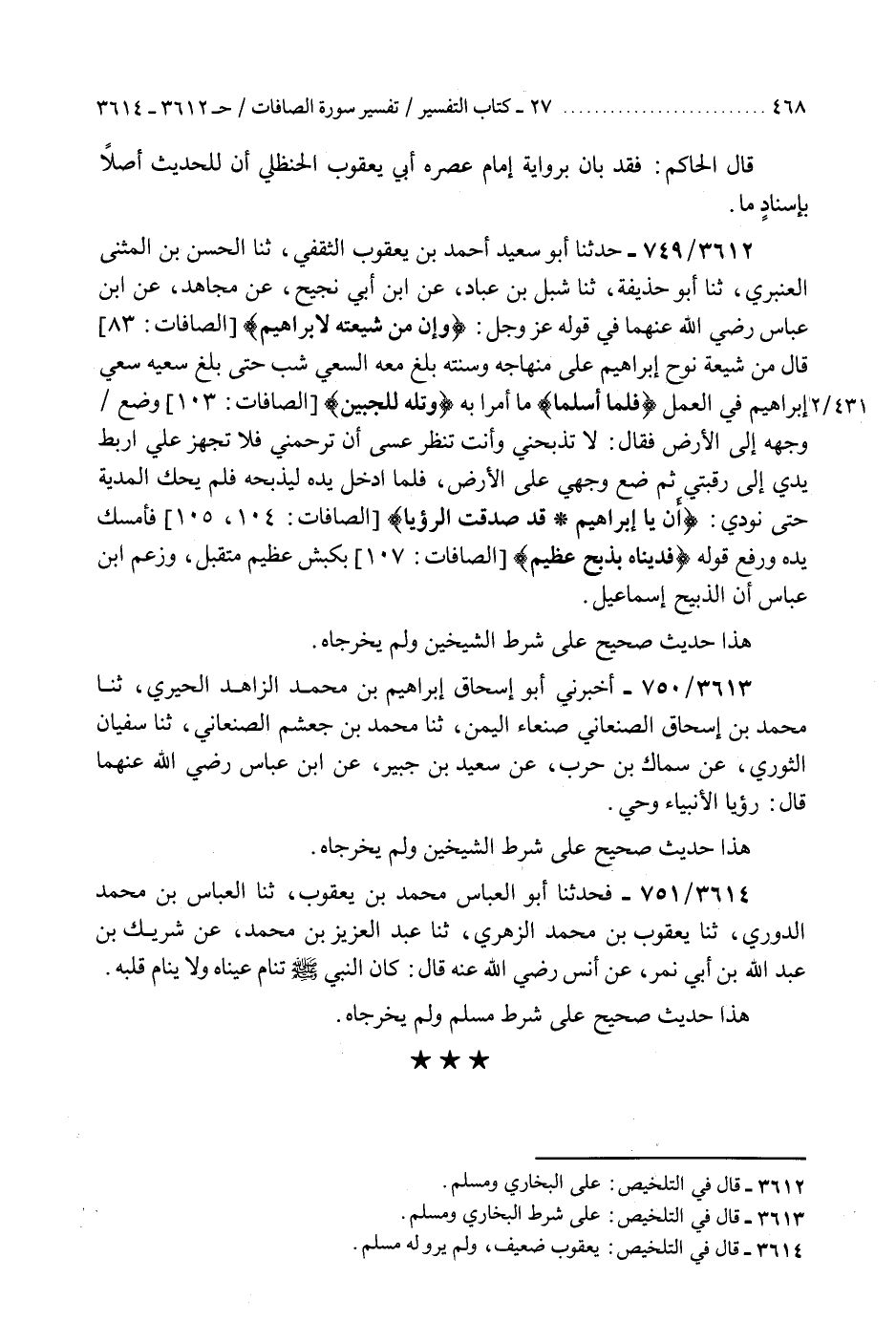 3612 - حَدَّثَنَا أَبُو سَعِيدٍ أَحْمَدُ بْنُ يَعْقُوبَ الثَّقَفِيُّ، ثنا الْحَسَنُ بْنُ الْمُثَنَّى الْعَنْبَرِيُّ، ثنا أَبُو حُذَيْفَةَ، ثنا شِبْلُ بْنُ عَبَّادٍ، عَنِ ابْنِ أَبِي نَجِيحٍ، عَنْ مُجَاهِدٍ، عَنِ ابْنِ عَبَّاسٍ رَضِيَ اللَّهُ عَنْهُمَا، فِي قَوْلِهِ عَزَّ وَجَلَّ {وَإِنَّ مِنْ شِيعَتِهِ لِإِبْرَاهِيمَ} [الصافات: 83] قَالَ: §" مِنْ شِيعَةِ نُوحٍ إِبْرَاهِيمُ عَلَى مِنْهَاجِهِ وَسُنَّتِهِ بَلَغَ مَعَهُ السَّعْيَ شَبَّ حَتَّى بَلَغَ سَعْيُهُ سَعْيَ إِبْرَاهِيمَ فِي الْعَمَلِ، فَلَمَّا أَسْلَمَا مَا أُمِرَا بِهِ وَتَلَّهُ لِلْجَبِينِ وَضَعَ وَجْهَهُ إِلَى الْأَرْضِ فَقَالَ: لَا تَذْبَحْنِي وَأَنْتَ تَنْظُرُ عَسَى أَنْ تَرْحَمَنِي فَلَا تُجْهِزْ عَلَيَّ ارْبُطْ يَدَيَّ إِلَى رَقَبَتِي، ثُمَّ ضَعْ وَجْهِي عَلَى الْأَرْضِ فَلَمَّا أَدْخَلَ يَدَهُ لِيَذْبَحَهُ فَلَمْ يَحُكَّ الْمُدْيَةَ حَتَّى نُودِيَ {أَنْ يَا إِبْرَاهِيمُ قَدْ صَدَّقْتَ الرُّؤْيَا} [الصافات: 105] فَأَمْسَكَ يَدَهُ وَرَفَعَ قَوْلُهُ {وَفَدَيْنَاهُ بِذِبْحٍ عَظِيمٍ} [الصافات: 107] بِكَبْشٍ عَظِيمٍ مُتَقَبَّلٍ «وَزَعَمَ ابْنُ عَبَّاسٍ أَنَّ الذَّبِيحَ إِسْمَاعِيلُ» هَذَا حَدِيثٌ صَحِيحٌ عَلَى شَرْطِ الشَّيْخَيْنِ وَلَمْ يُخْرِجَاهُ "K3612 - على البخاري ومسلم