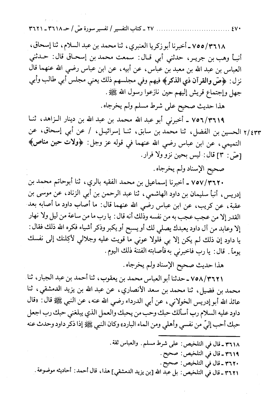 3619 - أَخْبَرَنِي أَبُو عَبْدِ اللَّهِ مُحَمَّدُ بْنُ عَبْدِ اللَّهِ بْنِ دِينَارٍ الزَّاهِدُ، ثنا الْحُسَيْنُ بْنُ الْفَضْلِ، ثنا مُحَمَّدُ بْنُ سَابِقٍ، ثنا إِسْرَائِيلُ، عَنْ أَبِي إِسْحَاقَ، عَنِ التَّمِيمِيِّ، عَنِ ابْنِ عَبَّاسٍ رَضِيَ اللَّهُ عَنْهُمَا، فِي قَوْلِهِ عَزَّ وَجَلَّ: {§وَلَاتَ حِينَ مَنَاصٍ} [ص: 3] قَالَ: «لَيْسَ بِحِينِ نَزْوٍ وَلَا فِرَارٍ» صَحِيحُ الْإِسْنَادِ وَلَمْ يُخْرِجَاهُ "K3619 - صحيح