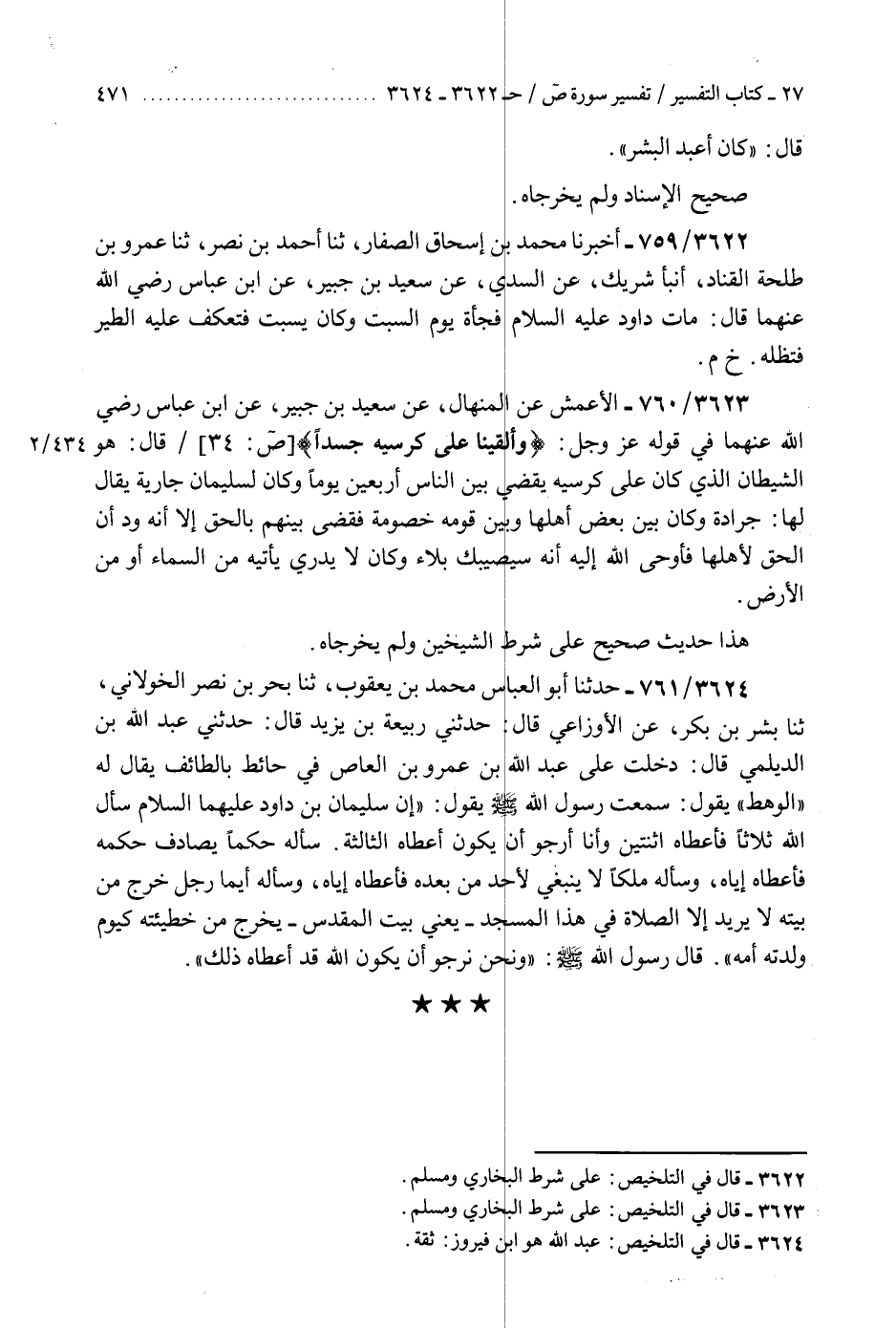3623 - الْأَعْمَشُ، عَنِ الْمِنْهَالِ، عَنْ سَعِيدِ بْنِ جُبَيْرٍ، عَنِ ابْنِ عَبَّاسٍ رَضِيَ اللَّهُ عَنْهُمَا، فِي قَوْلِهِ عَزَّ وَجَلَّ: {وَأَلْقَيْنَا عَلَى كُرْسِيِّهِ جَسَدًا} [ص: 34] قَالَ: §" هُوَ الشَّيْطَانُ الَّذِي كَانَ عَلَى كُرْسِيِّهِ يَقْضِي بَيْنَ النَّاسِ أَرْبَعِينَ يَوْمًا، وَكَانَ لِسُلَيْمَانَ جَارِيَةٌ يُقَالَ لَهَا: جَرَادَةُ وَكَانَ بَيْنَ بَعْضِ أَهْلِهَا وَبَيْنَ قَوْمِهِ خُصُومَةٌ، فَقَضَى بَيْنَهُمْ بِالْحَقِّ إِلَّا أَنَّهُ وَدَّ أَنَّ الْحَقَّ لِأَهْلِهَا، فَأَوْحَى اللَّهُ إِلَيْهِ أَنَّهُ سَيُصِيبُكَ بَلَاءٌ، وَكَانَ لَا يَدْرِي يَأْتِيهِ مِنَ السَّمَاءِ أَوْ مِنَ الْأَرْضِ «هَذَا حَدِيثٌ صَحِيحٌ عَلَى شَرْطِ الشَّيْخَيْنِ وَلَمْ يُخْرِجَاهُ» K3623 - على شرط البخاري ومسلم