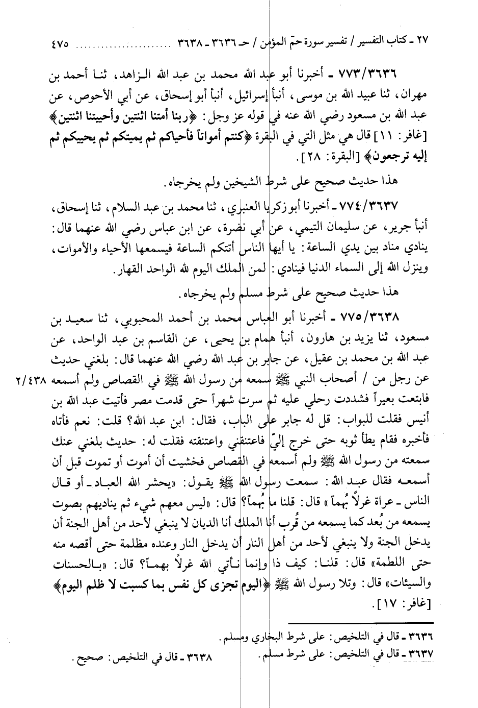 3636 - أَخْبَرَنَا أَبُو عَبْدِ اللَّهِ مُحَمَّدُ بْنُ عَبْدِ اللَّهِ الزَّاهِدُ، ثنا أَحْمَدُ بْنُ مِهْرَانَ، ثنا عُبَيْدُ اللَّهِ بْنُ مُوسَى، أَنْبَأَ إِسْرَائِيلُ، أَنْبَأَ أَبُو إِسْحَاقَ، عَنْ أَبِي الْأَحْوَصِ، عَنْ عَبْدِ اللَّهِ بْنِ مَسْعُودٍ رَضِيَ اللَّهُ عَنْهُ، فِي قَوْلِهِ عَزَّ وَجَلَّ {§رَبَّنَا أَمَتَّنَا اثْنَتَيْنِ وَأَحْيَيْتَنَا اثْنَتَيْنِ} [غافر: 11] قَالَ: " هِيَ مِثْلُ الَّتِي فِي الْبَقَرَةِ {كُنْتُمْ أَمْوَاتًا فَأَحْيَاكُمْ ثُمَّ يُمِيتُكُمْ ثُمَّ يُحْيِيكُمْ ثُمَّ إِلَيْهِ تُرْجَعُونَ} [البقرة: 28] «هَذَا حَدِيثٌ صَحِيحٌ عَلَى شَرْطِ الشَّيْخَيْنِ وَلَمْ يُخَرِّجَاهُ» K3636 - على شرط البخاري ومسلم
