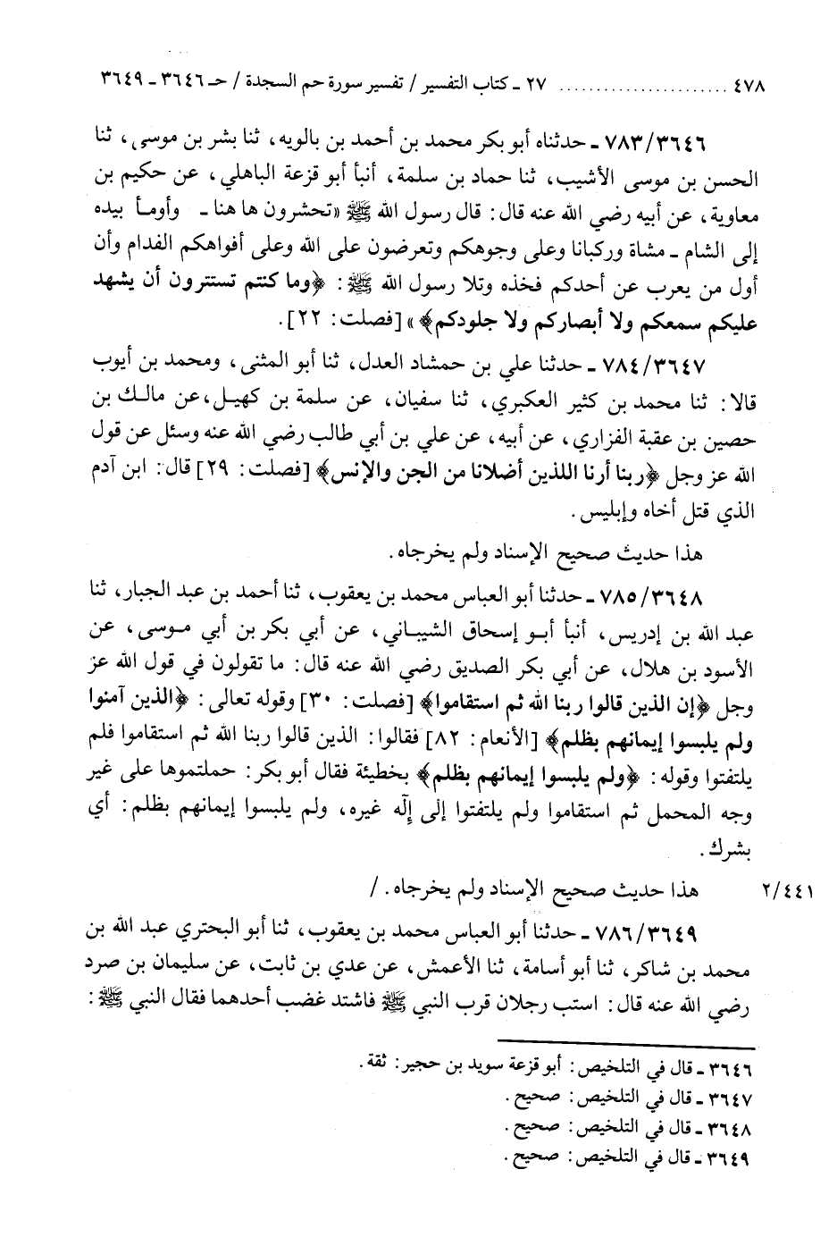 3646 - حَدَّثَنَاهُ أَبُو بَكْرٍ مُحَمَّدُ بْنُ أَحْمَدَ بْنِ بَالَوَيْهِ، ثنا بِشْرُ بْنُ مُوسَى، ثنا الْحَسَنُ بْنُ مُوسَى الْأَشْيَبُ، ثنا حَمَّادُ بْنُ سَلَمَةَ، أَنْبَأَ أَبُو قَزَعَةَ الْبَاهِلِيُّ، عَنْ حَكِيمِ بْنِ مُعَاوِيَةَ، عَنْ أَبِيهِ رَضِيَ اللَّهُ عَنْهُ، قَالَ: قَالَ رَسُولُ اللَّهِ صَلَّى اللهُ عَلَيْهِ وَسَلَّمَ: «§تُحْشَرُونَ هَا هُنَا وَأَوْمَأَ بِيَدِهِ إِلَى الشَّامِ مُشَاةً، وَرُكْبَانًا وَعَلَى وُجُوهِكُمْ، وَتُعْرَضُونَ عَلَى اللَّهِ وَعَلَى أَفْوَاهِكُمُ الْفِدَامُ، وَإِنَّ أَوَّلَ مَنْ يُعْرِبُ عَنْ أَحَدِكُمْ فَخِذُهُ» ، وَتَلَا رَسُولُ اللَّهِ صَلَّى اللهُ عَلَيْهِ وَسَلَّمَ: {وَمَا كُنْتُمْ تَسْتَتِرُونَ أَنْ يَشْهَدَ عَلَيْكُمْ سَمْعُكُمْ، وَلَا أَبْصَارُكُمْ وَلَا جُلُودُكُمْ} [فصلت: 22] K3646 - أبو قزعة سويد بن حجير ثقة