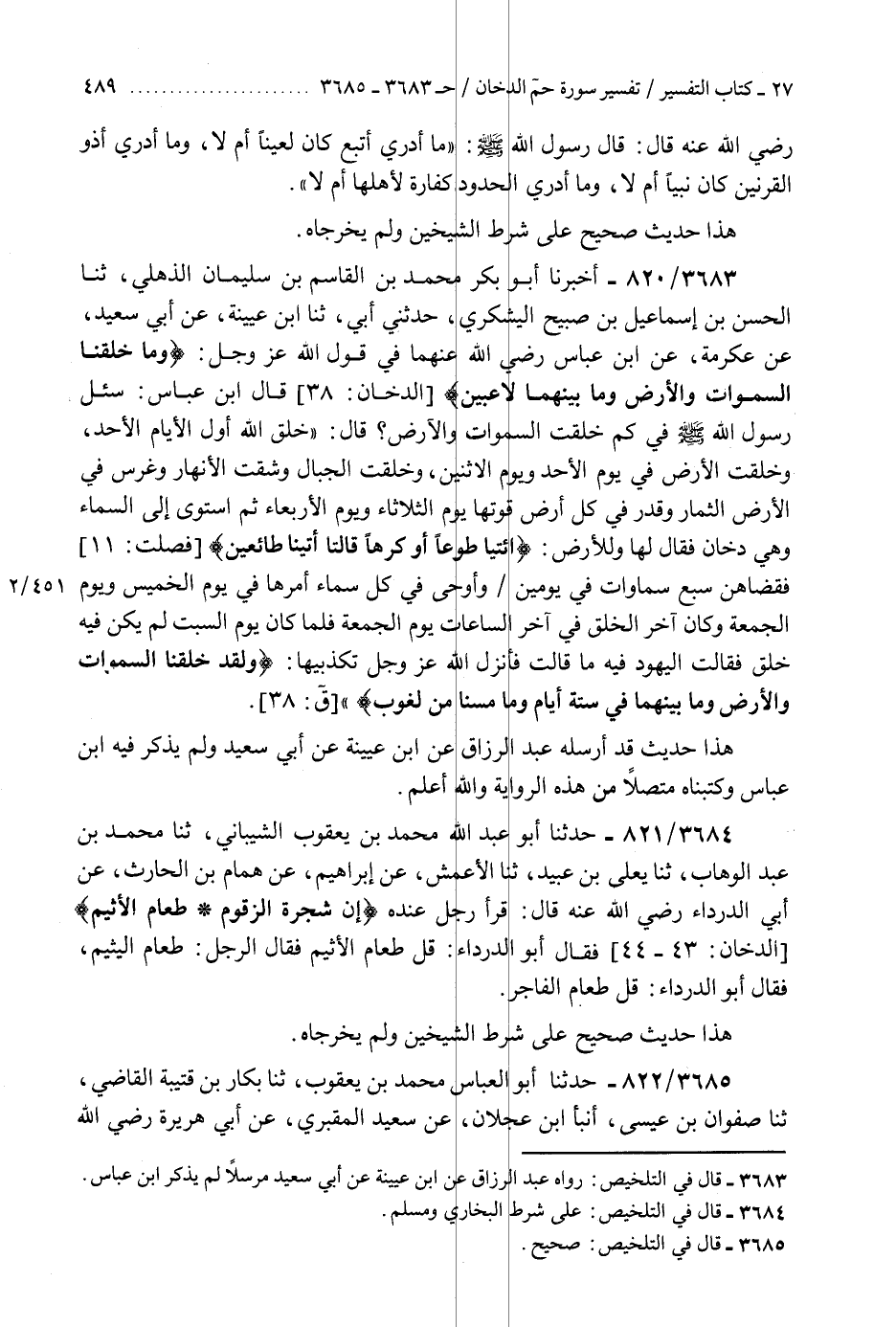 3684 - حَدَّثَنَا أَبُو عَبْدِ اللَّهِ مُحَمَّدُ بْنُ يَعْقُوبَ الشَّيْبَانِيُّ، ثنا مُحَمَّدُ بْنُ عَبْدِ الْوَهَّابِ، ثنا يَعْلَى بْنُ عُبَيْدٍ، ثنا الْأَعْمَشُ، عَنْ إِبْرَاهِيمَ، عَنْ هَمَّامِ بْنِ الْحَارِثِ، عَنْ أَبِي الدَّرْدَاءِ رَضِيَ اللَّهُ عَنْهُ، قَالَ: قَرَأَ رَجُلٌ عِنْدَهُ {إِنَّ شَجَرَةَ الزَّقُّومِ طَعَامُ الْأَثِيمِ} [الدخان: 44] فَقَالَ أَبُو الدَّرْدَاءِ: «§قُلْ طَعَامُ الْأَثِيمِ» فَقَالَ الرَّجُلُ: طَعَامُ الْيَثِيمِ. فَقَالَ أَبُو الدَّرْدَاءِ قُلْ: «طَعَامُ الْفَاجِرِ» هَذَا حَدِيثٌ صَحِيحٌ عَلَى شَرْطِ الشَّيْخَيْنِ وَلَمْ يُخَرِّجَاهُ "K3684 - على شرط البخاري ومسلم