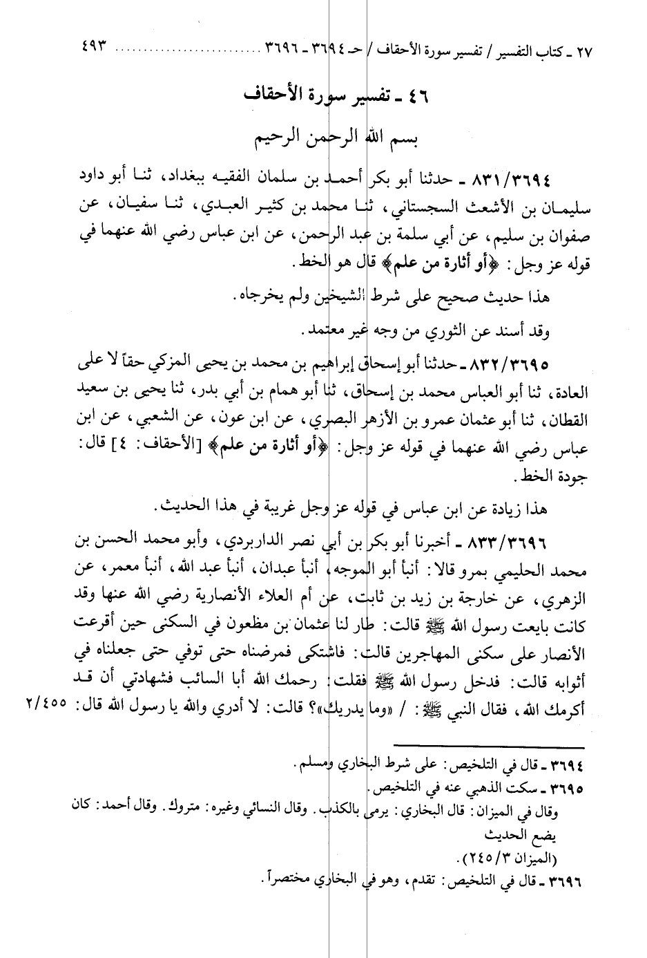 3695 - حَدَّثَنَا أَبُو إِسْحَاقَ إِبْرَاهِيمُ بْنُ مُحَمَّدِ بْنِ يَحْيَى الْمُزَكِّي، حَقًّا لَا عَلَى الْعَادَةِ، ثنا أَبُو الْعَبَّاسِ مُحَمَّدُ بْنُ إِسْحَاقَ، ثنا أَبُو هَمَّامِ بْنُ أَبِي بَدْرٍ، ثنا يَحْيَى بْنُ سَعِيدٍ الْقَطَّانُ، ثنا أَبُو عُثْمَانَ عَمْرُو بْنُ الْأَزْهَرِ الْبَصْرِيُّ، عَنِ ابْنِ عَوْنٍ، عَنِ الشَّعْبِيِّ، عَنِ ابْنِ عَبَّاسٍ رَضِيَ اللَّهُ عَنْهُمَا، فِي قَوْلِهِ عَزَّ وَجَلَّ {§أَوْ أَثَارَةٍ مِنْ عِلْمٍ} [الأحقاف: 4] قَالَ: «جَوْدَةُ الْخَطِّ» هَذَا زِيَادَةٌ عَنِ ابْنِ عَبَّاسٍ فِي قَوْلِهِ عَزَّ وَجَلَّ غَرِيبَةٌ فِي هَذَا الْحَدِيثِ "K3695 - سكت عنه الذهبي في التلخيص