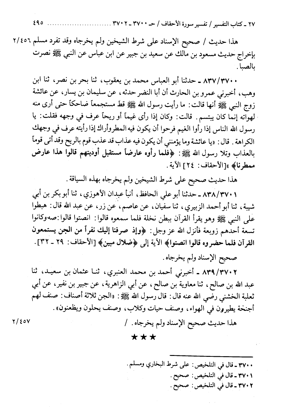 3701 - حَدَّثَنَا أَبُو عَلِيٍّ الْحَافِظُ، أَنْبَأَ عَبْدَانُ الْأَهْوَازِيُّ، ثنا أَبُو بَكْرِ بْنُ أَبِي شَيْبَةَ، ثنا أَبُو أَحْمَدَ الزُّبَيْرِيُّ، ثنا سُفْيَانُ، عَنْ عَاصِمٍ، عَنْ زِرٍّ، عَنْ عَبْدِ اللَّهِ، قَالَ: §" هَبَطُوا عَلَى النَّبِيِّ صَلَّى اللهُ عَلَيْهِ وَسَلَّمَ وَهُوَ يَقْرَأُ الْقُرْآنَ بِبَطْنِ نَخْلَةَ فَلَمَّا سَمِعُوهُ قَالُوا: أَنْصِتُوا. قَالُوا: صَهٍ. وَكَانُوا تِسْعَةً أَحَدُهُمْ زَوْبَعَةُ فَأَنْزَلَ اللَّهُ عَزَّ وَجَلَّ {وَإِذْ صَرَفْنَا إِلَيْكَ نَفَرًا مِنَ الْجِنِّ يَسْتَمِعُونَ الْقُرْآنَ، فَلَمَّا حَضَرُوهُ قَالُوا أَنْصِتُوا} [الأحقاف: 29] الْآيَةُ إِلَى {ضَلَالٍ مُبِينٍ} [آل عمران: 164] «صَحِيحُ الْإِسْنَادِ وَلَمْ يُخَرِّجَاهُ» K3701 - صحيح