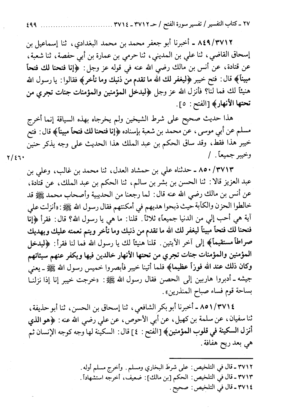 3712 - أَخْبَرَنَا أَبُو جَعْفَرٍ مُحَمَّدُ بْنُ مُحَمَّدٍ الْبَغْدَادِيُّ، ثنا إِسْمَاعِيلُ بْنُ إِسْحَاقَ الْقَاضِي، ثنا عَلِيُّ بْنُ الْمَدِينِيِّ، ثنا حَرَمِيُّ بْنُ عُمَارَةَ بْنِ أَبِي حَفْصَةَ، ثنا شُعْبَةُ، عَنْ قَتَادَةَ، عَنْ أَنَسِ بْنِ مَالِكٍ رَضِيَ اللَّهُ عَنْهُ، فِي قَوْلِهِ عَزَّ وَجَلَّ: " {§إِنَّا فَتَحْنَا لَكَ فَتْحًا مُبِينًا} [الفتح: 1] " قَالَ: فَتْحُ خَيْبَرَ {لِيَغْفِرَ لَكَ اللَّهُ مَا تَقَدَّمَ مِنْ ذَنْبِكَ وَمَا تَأَخَّرَ} [الفتح: 2] فَقَالُوا: يَا رَسُولَ اللَّهِ، هَنِيئًا لَكَ فَمَا لَنَا؟ فَأَنْزَلَ اللَّهُ عَزَّ وَجَلَّ: " {لِيُدْخِلَ الْمُؤْمِنِينَ وَالْمُؤْمِنَاتِ جَنَّاتٍ تَجْرِي مِنْ تَحْتِهَا الْأَنْهَارُ} [الفتح: 5] «هَذَا حَدِيثٌ صَحِيحٌ عَلَى شَرْطِ الشَّيْخَيْنِ وَلَمْ يُخَرِّجَاهُ بِهَذِهِ السِّيَاقَةِ» ، إِنَّمَا أَخْرَجَ مُسْلِمٌ عَنْ أَبِي مُوسَى، عَنْ مُحَمَّدِ بْنِ شُعْبَةَ بِإِسْنَادِهِ {إِنَّا فَتَحْنَا لَكَ فَتْحًا مُبِينًا} [الفتح: 1] قَالَ: فَتْحُ خَيْبَرَ. هَذَا فَقَطْ وَقَدْ سَاقَ الْحَكَمُ بْنُ عَبْدِ الْمَلِكِ هَذَا الْحَدِيثَ عَلَى وَجْهٍ يَذْكُرُ حُنَيْنًا وَخَيْبَرَ جَمِيعًاK3712 - على شرط البخاري ومسلم وأخرج مسلم أوله